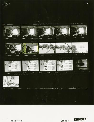 Keywords: Ford A0436 NLGRF photo contact sheet (1974-08-30)(Gerald Ford Library).jpg White House Photographic Office WHPO is housed at the Gerald R Ford Presidential Library a branch of the National Archives and Records Administration NARA <br/><br/> This file is a 200 dpi photo contact sheet having images from roll of film A0436 of the August 9 1974 - January 20 1977 Gerald R Ford White House Photographic Office Series A0001-A9999 and B0001-B2886 photographs <br/><br/> The date on the photo contact sheet is the date the roll of film was processed not necessarily the date the photographs were taken See table below for additional details 1974-08-30 Gerald R Ford Presidential Library Image http //www fordlibrarymuseum gov/library/whphotos/A0436_NLGRF jpg A0436_NLGRF jpg from http //www fordlibrarymuseum gov/library/whphotos/19740830whpo pdf White House Photographs August 30 1974 of the http //www fordlibrarymuseum gov/Library/whphotos/whpo asp White House Photographic Collection page White House Photographic Office WHPO <br/> Creator David Hume Kennerly PD-USGov Institution Institution Gerald R Ford Presidential Library Table wikitable sortable + Photo contact sheet A0436 U S President Ford Administration Gerald R Ford Library Frame s Tone Subject proper Subject generic Names Geographic Location Photographer Date - 3-7 BW Return from Andrews Air Force Base reading; pipe in mouth; glasses on top of head GRF Washington DC Marine One Kennerly 1974-08-30 - 8-9 BW Return from Andrews Air Force Base talking; glasses on top of head GRF Haig Washington DC Marine One Kennerly 1974-08-30 - 10-11 BW Return from Andrews Air Force Base waving walking from helicopter GRF Secret Service Marine One Crew South Lawn Kennerly 1974-08-30 - 12-16 BW Return from Andrews Air Force Base GRF walking; Mrs Ford and Howe waving from Balcony GRF Betty Ford Nancy Howe Others South Lawn towards Truman Balcony Kennerly 1974-08-30 - 17 BW walking into Cross Hall GRF Blue Room Kennerly 1974-08-30 - 18 BW Staff Assistant on telephone Nell Yates Secretary's Office Kennerly 1974-08-30 Gerald R Ford Presidential Library and Museum-cooperation PD-USGov Contact sheets by the Ford White House August 1974 Photographs by David Hume Kennerly from 1974