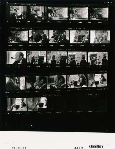 | Keywords: Ford A0535 NLGRF photo contact sheet (1974-09-05)(Gerald Ford Library).jpg White House Photographic Office WHPO is housed at the Gerald R Ford Presidential Library a branch of the National Archives and Records Administration NARA <br/><br/> This file is a 200 dpi photo contact sheet having images from roll of film A0535 of the August 9 1974 - January 20 1977 Gerald R Ford White House Photographic Office Series A0001-A9999 and B0001-B2886 photographs <br/><br/> The date on the photo contact sheet is the date the roll of film was processed not necessarily the date the photographs were taken See table below for additional details 1974-09-05 Gerald R Ford Presidential Library Image http //www fordlibrarymuseum gov/library/whphotos/A0535_NLGRF jpg A0535_NLGRF jpg from http //www fordlibrarymuseum gov/library/whphotos/19740905whpo pdf White House Photographs September 5 1974 of the http //www fordlibrarymuseum gov/Library/whphotos/whpo asp White House Photographic Collection page White House Photographic Office WHPO <br/> Creator David Hume Kennerly PD-USGov Institution Institution Gerald R Ford Presidential Library Table wikitable sortable + Photo contact sheet A0535 U S President Ford Administration Gerald R Ford Library Frame s Tone Subject proper Subject generic Names Geographic Location Photographer Date - 1-2 BW eating breakfast; reading paper - from Center Hall GRF Second Floor - Family Dining Room Kennerly 1974-09-05 - 3-6 BW eating breakfast; reading paper GRF Second Floor - Family Dining Room Kennerly 1974-09-05 - 7-10 BW seated around desk GRF Hartmann Oval Office Kennerly 1974-09-05 - 11 BW seated at desk smoking pipe - left profile GRF Oval Office Kennerly 1974-09-05 - 12-13 BW seated at desk smoking pipe GRF Oval Office Kennerly 1974-09-05 - 14-15 BW seated at desk smoking pipe - head and shoulders GRF Oval Office Kennerly 1974-09-05 - 16 BW seated at desk smoking pipe - head and shoulders GRF Oval Office Kennerly 1974-09-05 - 17 BW seated at desk smoking pipe - left profile GRF Oval Office Kennerly 1974-09-05 - 18 BW seated at desk smoking pipe - left profile GRF Oval Office Kennerly 1974-09-05 - 19-21 BW GRF seated smoking pipe; Hartmann standing behind GRF Hartmann Oval Office Kennerly 1974-09-05 - 22 BW GRF seated smoking pipe GRF Oval Office Kennerly 1974-09-05 Gerald R Ford Presidential Library and Museum-cooperation PD-USGov Contact sheets by the Ford White House September 1974 Photographs by David Hume Kennerly from 1974 |