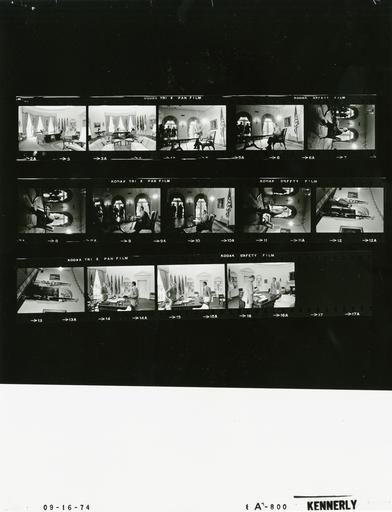 | Keywords: Ford A0800 NLGRF photo contact sheet (1974-09-16)(Gerald Ford Library).jpg  White House Photographic Office WHPO is housed at the Gerald R Ford Presidential Library a branch of the National Archives and Records Administration NARA <br/><br/> This file is a 200 dpi photo contact sheet having images from roll of film A0800 of the August 9 1974 - January 20 1977 Gerald R Ford White House Photographic Office Series A0001-A9999 and B0001-B2886 photographs <br/><br/> The date on the photo contact sheet is the date the roll of film was processed not necessarily the date the photographs were taken See table below for additional details 1974-09-16 Gerald R Ford Presidential Library Image http //www fordlibrarymuseum gov/library/whphotos/A0800_NLGRF jpg A0800_NLGRF jpg from http //www fordlibrarymuseum gov/library/whphotos/19740916whpo pdf White House Photographs September 16 1974 of the http //www fordlibrarymuseum gov/Library/whphotos/whpo asp White House Photographic Collection page White House Photographic Office WHPO <br/> Creator David Hume Kennerly PD-USGov Institution Institution Gerald R Ford Presidential Library Table wikitable sortable + Photo contact sheet A0800 U S President Ford Administration Gerald R Ford Library Frame s Tone Subject proper Subject generic Names Geographic Location Photographer Date - 3-4 BW Counsellor to the President seated around desk; GRF holding up document in 2nd frame; long shots GRF Hartmann Oval Office Kennerly 1974-09-16 - 5 BW Prior to Proclamation Announcing a Program for the Return of Vietnam Era Draft Evaders GRF entering room GRF Media Cabinet Room Kennerly 1974-09-16 - 6-10 BW Proclamation Announcing a Program for the Return of Vietnam Era Draft Evaders GRF seated reading GRF Media Cabinet Room Kennerly 1974-09-16 - 11 BW Following Proclamation Announcing a Program for the Return of Vietnam Era Draft Evaders GRF rising from chair GRF Media Cabinet Room Kennerly 1974-09-16 - 12-13 BW Following Proclamation Announcing a Program for the Return of Vietnam Era Draft Evaders leaving room GRF Cabinet Room Kennerly 1974-09-16 - 14-16 BW Assistant Press Secretary standing talking near desk GRF Hushen Oval Office Kennerly 1974-09-16 Gerald R Ford Presidential Library and Museum-cooperation PD-USGov Contact sheets by the Ford White House September 1974 Photographs by David Hume Kennerly from 1974 |