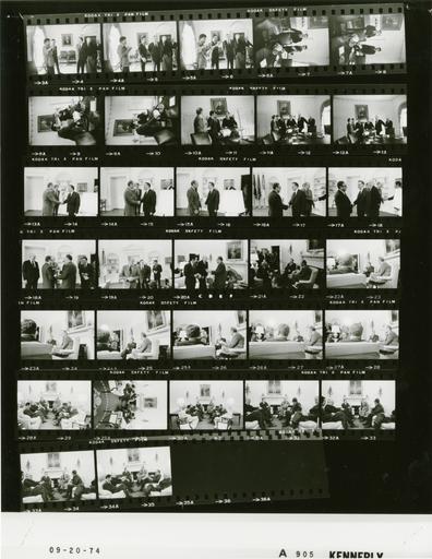 | Keywords: Ford A0905 NLGRF photo contact sheet (1974-09-20)(Gerald Ford Library).jpg White House Photographic Office WHPO is housed at the Gerald R Ford Presidential Library a branch of the National Archives and Records Administration NARA <br/><br/> This file is a 200 dpi photo contact sheet having images from roll of film A0905 of the August 9 1974 - January 20 1977 Gerald R Ford White House Photographic Office Series A0001-A9999 and B0001-B2886 photographs <br/><br/> The date on the photo contact sheet is the date the roll of film was processed not necessarily the date the photographs were taken See table below for additional details 1974-09-20 Gerald R Ford Presidential Library Image http //www fordlibrarymuseum gov/library/whphotos/A0905_NLGRF jpg A0905_NLGRF jpg from http //www fordlibrarymuseum gov/library/whphotos/19740920whpo pdf White House Photographs September 20 1974 of the http //www fordlibrarymuseum gov/Library/whphotos/whpo asp White House Photographic Collection page White House Photographic Office WHPO <br/> Creator David Hume Kennerly PD-USGov Institution Institution Gerald R Ford Presidential Library Table wikitable sortable + Photo contact sheet A0905 U S President Ford Administration Gerald R Ford Library Frame s Tone Subject proper Subject generic Names Geographic Location Photographer Date - 4-6 BW Soviet Foreign Minister; Ambassador of Union of Soviet Socialist Republics USSR to United States Thomas speaking pointing; Gromyko and Sukhrodev listening; others in back Ambassador Stoessel Andrei Gromyko Ambassador Anatoly Dobrynin Victor Sukhrodev Ricardo Thomas Cabinet Room Kennerly 1974-09-20 - 7-10 BW Soviet Foreign Minister; interpreter looking at Apollo-Soyuz model on table Andrei Gromyko Victor Sukhrodev Cabinet Room Kennerly 1974-09-20 - 11 BW Soviet Foreign Minister; interpreter talking near Apollo-Soyuz model on table Scowcroft Andrei Gromyko Ambassador Henry Catto Victor Sukhrodev Cabinet Room Kennerly 1974-09-20 - 12-13 BW Soviet Foreign Minister; Ambassador of Union of Soviet Socialist Republics USSR to United States talking near Apollo-Soyuz model on table Scowcroft Andrei Gromyko Ambassador Henry Catto Victor Sukhrodev Ambassador Stoessel Ambassador Anatoly Dobrynin Cabinet Room Kennerly 1974-09-20 - 14-16 BW Soviet Foreign Minister; Ambassador of Union of Soviet Socialist Republics USSR to United States greeting handshaking; Catto obscured in third frame GRF Andrei Gromyko Ambassador Henry Catto Ambassador Anatoly Dobrynin Oval Office Kennerly 1974-09-20 - 17-18 BW Soviet Foreign Minister; Ambassador of Union of Soviet Socialist Republics USSR to United States greeting handshaking GRF Kissinger Andrei Gromyko Ambassador Henry Catto Ambassador Anatoly Dobrynin Oval Office Kennerly 1974-09-20 - 19 BW Soviet Foreign Minister; Ambassador of Union of Soviet Socialist Republics USSR to United States greeting handshaking GRF Kissinger Ambassador Stoessel Andrei Gromyko Ambassador Anatoly Dobrynin Victor Sukhrodev Ambassador Henry Catto Oval Office Kennerly 1974-09-20 - 20 BW Soviet Foreign Minister; interpreter walking towards fireplace GRF Andrei Gromyko Victor Sukhrodev Oval Office Kennerly 1974-09-20 - 21 BW Soviet Foreign Minister; Ambassador of Union of Soviet Socialist Republics USSR to United States three standing near fireplace; GRF seated in background GRF Kissinger Ambassador Anatoly Dobrynin Victor Sukhrodev Oval Office Kennerly 1974-09-20 - 22 BW Soviet Foreign Minister; Ambassador of Union of Soviet Socialist Republics USSR to United States seated near fireplace; Kissinger's back to camera; media in background GRF Andrei Gromyko Ambassador Anatoly Dobrynin Kissinger Media Oval Office Kennerly 1974-09-20 - 23-25 BW Soviet Foreign Minister; Ambassador of Union of Soviet Socialist Republics USSR to United States seated near fireplace; Kissinger's back to camera; media in background GRF Kissinger Andrei Gromyko Media Oval Office Kennerly 1974-09-20 - 26-28 BW Soviet Foreign Minister; Ambassador of Union of Soviet Socialist Republics USSR to United States seated near fireplace; Kissinger's back to camera; media in background GRF Kissinger Andrei Gromyko Ambassador Anatoly Dobrynin Victor Sukhrodev Media Oval Office Kennerly 1974-09-20 - 29-31 BW Soviet Foreign Minister; Ambassador of Union of Soviet Socialist Republics USSR to United States; Brezhnev's personal interpreter Sukhrodev seated near fireplace GRF Kissinger Ambassador Stoessel Andrei Gromyko Ambassador Anatoly Dobrynin Victor Sukhrodev Oval Office Kennerly 1974-09-20 - 32 BW Soviet Foreign Minister; Ambassador of Union of Soviet Socialist Republics USSR to United States Dobrynin; U S Ambassador to USSR Stoessel seated near fireplace GRF Kissinger Ambassador Walter J Stoessel Andrei Gromyko Ambassador Anatoly Dobrynin Oval Office Kennerly 1974-09-20 - 33-35 BW Soviet Foreign Minister; Ambassador of Union of Soviet Socialist Republics USSR to United States seated near fireplace GRF Kissinger Ambassador Stoessel Andrei Gromyko Ambassador Anatoly Dobrynin Victor Sukhrodev Oval Office Kennerly 1974-09-20 Gerald R Ford Presidential Library and Museum-cooperation PD-USGov Contact sheets by the Ford White House September 1974 Photographs by David Hume Kennerly from 1974 |