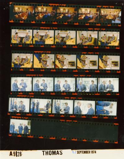 | Keywords: Ford A0928 NLGRF photo contact sheet (1974-09-20)(Gerald Ford Library).jpg White House Photographic Office WHPO is housed at the Gerald R Ford Presidential Library a branch of the National Archives and Records Administration NARA <br/><br/> This file is a 200 dpi photo contact sheet having images from roll of film A0928 of the August 9 1974 - January 20 1977 Gerald R Ford White House Photographic Office Series A0001-A9999 and B0001-B2886 photographs <br/><br/> The date on the photo contact sheet is the date the roll of film was processed not necessarily the date the photographs were taken See table below for additional details 1974-09-20 Gerald R Ford Presidential Library Image http //www fordlibrarymuseum gov/library/whphotos/A0928_NLGRF jpg A0928_NLGRF jpg from http //www fordlibrarymuseum gov/library/whphotos/19740920whpo pdf White House Photographs September 20 1974 of the http //www fordlibrarymuseum gov/Library/whphotos/whpo asp White House Photographic Collection page White House Photographic Office WHPO - Thomas PD-USGov Institution Institution Gerald R Ford Presidential Library Table wikitable sortable + Photo contact sheet A0928 U S President Ford Administration Gerald R Ford Library Frame s Tone Subject proper Subject generic Names Geographic Location Photographer Date - 3-7 Color Discussion of Proposals for Nat Development Bank and a Nat Growth Policy seated around table GRF David Rockefeller Warren Lindquist Owen Frisby John R Price Lynn Cole Seidman William E Casselman III Cabinet Room Thomas 1974-09-20 - 8-17 Color Governor of Puerto Rico seated near fireplace GRF Rafael Hernandez-Colon Oval Office Thomas 1974-09-21 - 18-20 Color National Commander Veterans of Foreign Wars VFW standing talking; GRF receiving gift GRF John Stang Oval Office Thomas 1974-09-21 - 21-23 Color National Commander Veterans of Foreign Wars VFW GRF wearing white VFW cap GRF John Stang Oval Office Thomas 1974-09-21 - 24 Color National Commander; Executive Director - Veterans of Foreign Wars VFW GRF wearing white VFW cap receiving gift from Stang GRF John Stang Casper Holt Powell Moore Oval Office Thomas 1974-09-21 - 25 Color National Commander Veterans of Foreign Wars VFW GRF wearing white VFW cap receiving gift GRF John Stang Oval Office Thomas 1974-09-21 - 26 Color Chairman Department of Economics Princeton University standing talking - close-up GRF Albert Rees Oval Office Thomas 1974-09-21 - 27 Color Chairman Department of Economics Princeton University standing talking - medium range GRF Albert Rees Oval Office Thomas 1974-09-21 - 28 Color Chairman Department of Economics Princeton University standing talking GRF Rush Albert Rees Oval Office Thomas 1974-09-21 Gerald R Ford Presidential Library and Museum-cooperation PD-USGov Contact sheets by the Ford White House September 1974 |
