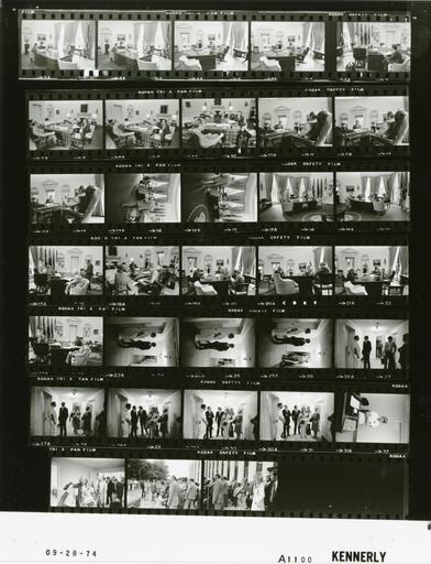 | Keywords: Ford A1100 NLGRF photo contact sheet (1974-09-28)(Gerald Ford Library).jpg  White House Photographic Office WHPO is housed at the Gerald R Ford Presidential Library a branch of the National Archives and Records Administration NARA <br/><br/> This file is a 200 dpi photo contact sheet having images from roll of film A1100 of the August 9 1974 - January 20 1977 Gerald R Ford White House Photographic Office Series A0001-A9999 and B0001-B2886 photographs <br/><br/> The date on the photo contact sheet is the date the roll of film was processed not necessarily the date the photographs were taken See table below for additional details 1974-09-28 Gerald R Ford Presidential Library Image http //www fordlibrarymuseum gov/library/whphotos/A1100_NLGRF jpg A1100_NLGRF jpg from http //www fordlibrarymuseum gov/library/whphotos/19740928whpo pdf White House Photographs September 28 1974 of the http //www fordlibrarymuseum gov/Library/whphotos/whpo asp White House Photographic Collection page White House Photographic Office WHPO <br/> Creator David Hume Kennerly PD-USGov Institution Institution Gerald R Ford Presidential Library Table wikitable sortable + Photo contact sheet A1100 U S President Ford Administration Gerald R Ford Library Frame s Tone Subject proper Subject generic Names Geographic Location Photographer Date - 3-13 BW Chief of Staff seated around desk - taken from different angles GRF Rumsfeld Oval Office Kennerly 1974-09-28 - 14-16 BW GRF seated Hartmann standing leaning over; Buchen walking towards desk GRF Hartmann Buchen Oval Office Kennerly 1974-09-28 - 17 BW seated around desk GRF Hartmann Buchen Oval Office Kennerly 1974-09-28 - 18 BW seated around desk; Marsh standing GRF Hartmann Buchen Marsh Oval Office Kennerly 1974-09-28 - 19-23 BW seated around desk - taken from different angles GRF Hartmann Buchen Marsh Oval Office Kennerly 1974-09-28 - 24-25 BW Trip to Hospital to visit Betty Ford -Bethesda Maryland standing talking Lukash Navy Doctor Bethesda MD Bethesda Naval Hospital - Hallway Kennerly 1974-09-28 - 26-27 BW Trip to Hospital to visit Betty Ford -Bethesda Maryland standing talking; Unidentified Man walking down hallway Lukash Navy Doctor Unidentified Man Bethesda MD Bethesda Naval Hospital - Hallway Kennerly 1974-09-28 - 28-31 BW Trip to Hospital to visit Betty Ford -Bethesda Maryland standing talking handshaking Lukash Navy Doctor Susan Ford Gayle Ford Janet Ford Billy Zeoli Bethesda MD Bethesda Naval Hospital - Hallway Kennerly 1974-09-28 - 32 BW Betty Ford's Nurse - Bethesda Maryland seated smiling arms folded Nurse Jo Ann O'Brien Bethesda MD Bethesda Naval Hospital - Nurse's Station Kennerly 1974-09-28 - 33 BW Trip to Hospital to visit Betty Ford -Bethesda Maryland walking out of hospital GRF Susan Ford Gayle Ford Janet Ford Billy Zeoli Unidentified Man Bethesda MD Bethesda Naval Hospital - Hallway Kennerly 1974-09-28 - 34-35 BW Report on vsit with Betty Ford - Bethesda Maryland GRF at microphones making statement GRF Susan Ford Mike Ford Gayle Ford Janet Ford Billy Zeoli Media Secret Service Bethesda MD Steps outside Bethesda Naval Hospital Kennerly 1974-09-28 Gerald R Ford Presidential Library and Museum-cooperation PD-USGov Contact sheets by the Ford White House September 1974 Photographs by David Hume Kennerly from 1974 |