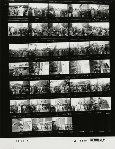 | Keywords: Ford A1549 NLGRF photo contact sheet (1974-10-21)(Gerald Ford Library).jpg White House Photographic Office WHPO is housed at the Gerald R Ford Presidential Library a branch of the National Archives and Records Administration NARA <br/><br/> This file is a 200 dpi photo contact sheet having images from roll of film A1549 of the August 9 1974 - January 20 1977 Gerald R Ford White House Photographic Office Series A0001-A9999 and B0001-B2886 photographs <br/><br/> The date on the photo contact sheet is the date the roll of film was processed not necessarily the date the photographs were taken See table below for additional details 1974-10-21 Gerald R Ford Presidential Library Image http //www fordlibrarymuseum gov/library/whphotos/A1549_NLGRF jpg A1549_NLGRF jpg from http //www fordlibrarymuseum gov/library/whphotos/19741021whpo pdf White House Photographs October 21 1974 of the http //www fordlibrarymuseum gov/Library/whphotos/whpo asp White House Photographic Collection page White House Photographic Office WHPO <br/> Creator David Hume Kennerly PD-USGov Institution Institution Gerald R Ford Presidential Library Table wikitable sortable + Photo contact sheet A1549 U S President Ford Administration Gerald R Ford Library Frame s Tone Subject proper Subject generic Names Geographic Location Photographer Date - 2A-4A BW Trip to Mexico; President of Mexico -Nogales Arizona/Nogales Mexico walking; greeting handshaking - all not in every frame GRF Luis Echeverria Secret Service Crowd Nogales AZ / Nogales Mexico United States - Mexico Border Kennerly 1974-10-21 - 5A-7A BW Trip to Mexico; President of Mexico -Nogales Arizona/Nogales Mexico walking; greeting handshaking; glass building in background - all not in every frame GRF Luis Echeverria Secret Service Crowd Nogales AZ / Nogales Mexico United States - Mexico Border Kennerly 1974-10-21 - 8A-10A BW Trip to Mexico; President of Mexico -Nogales Arizona/Nogales Mexico standing near Benito Juarez Monument GRF Luis Echeverria Others Nogales AZ / Nogales Mexico United States - Mexico Border Kennerly 1974-10-21 - 11A-34A BW Trip to Mexico; President of Mexico -Nogales Arizona/Nogales Mexico walking through both cities waving to crowd - all not in every frame GRF Luis Echeverria Others Nogales AZ / Nogales Mexico United States - Mexico Border Kennerly 1974-10-21 Gerald R Ford Presidential Library and Museum-cooperation PD-USGov Contact sheets by the Ford White House October 1974 Photographs by David Hume Kennerly from 1974 |