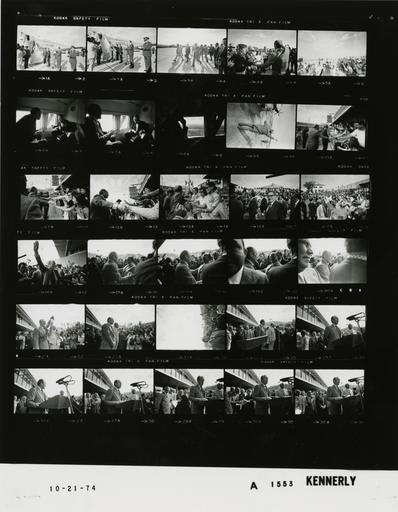 | Keywords: Ford A1553 NLGRF photo contact sheet (1974-10-21)(Gerald Ford Library).jpg White House Photographic Office WHPO is housed at the Gerald R Ford Presidential Library a branch of the National Archives and Records Administration NARA <br/><br/> This file is a 200 dpi photo contact sheet having images from roll of film A1553 of the August 9 1974 - January 20 1977 Gerald R Ford White House Photographic Office Series A0001-A9999 and B0001-B2886 photographs <br/><br/> The date on the photo contact sheet is the date the roll of film was processed not necessarily the date the photographs were taken See table below for additional details 1974-10-21 Gerald R Ford Presidential Library Image http //www fordlibrarymuseum gov/library/whphotos/A1553_NLGRF jpg A1553_NLGRF jpg from http //www fordlibrarymuseum gov/library/whphotos/19741021whpo pdf White House Photographs October 21 1974 of the http //www fordlibrarymuseum gov/Library/whphotos/whpo asp White House Photographic Collection page White House Photographic Office WHPO <br/> Creator David Hume Kennerly PD-USGov Institution Institution Gerald R Ford Presidential Library Table wikitable sortable + Photo contact sheet A1553 U S President Ford Administration Gerald R Ford Library Frame s Tone Subject proper Subject generic Names Geographic Location Photographer Date - 8A BW Flight to Nogales AZ seated looking out window; silhouette copter GRF Marine One Kennerly 1974-10-21 - 9A BW Arrival in Nogales Arizona GRF standing near Marine One copter ; waving to crowd in far background GRF Crowd Nogales AZ Nogales AZ helipad Kennerly 1974-10-21 - 10A-13A BW Trip to United States - Mexico Border - Nogales Arizona greeting handshaking mingling GRF Crowd Nogales AZ Downtown Street Kennerly 1974-10-21 - 14A BW Trip to United States - Mexico Border - Nogales Arizona walking Kissinger Others Nogales AZ Downtown Street Kennerly 1974-10-21 - 15A-16A BW Trip to United States - Mexico Border - Nogales Arizona GRF walking waving GRF Crowd Nogales AZ Downtown Street Kennerly 1974-10-21 - 17A-20A BW Trip to United States - Mexico Border - Nogales Arizona greeting embracing - partially obscured on some frames GRF Luis Echeverria Nogales AZ Downtown Street Kennerly 1974-10-21 - 21A-23A BW Trip to United States - Mexico Border - Nogales Arizona standing near microphone; hands raised GRF Luis Echeverria Others Nogales AZ Platform Kennerly 1974-10-21 - 24A BW Trip to United States - Mexico Border - Nogales Arizona standing Echeverria speaking into microphone GRF Luis Echeverria Others Nogales AZ Platform Kennerly 1974-10-21 - 25A-30A BW Trip to United States - Mexico Border - Nogales Arizona standing GRF speaking into microphone GRF Luis Echeverria Others Nogales AZ Platform Kennerly 1974-10-21 - 1A-2A BW Trip to Arizona - Tucson Arizona GRF walking down steps of Air Force One; others standing applauding GRF Welcoming Committee Others Tucson AZ Davis-Monthan Air Force Base Kennerly 1974-10-21 - 3A BW Trip to Arizona -Tucson Arizona walking towards crowd GRF Welcoming Committee Others Tucson AZ Davis-Monthan Air Force Base Kennerly 1974-10-21 - 4A-5A BW Trip to Arizona -Tucson Arizona greeting handshaking waving GRF Crowd Tucson AZ Davis-Monthan Air Force Base Kennerly 1974-10-21 - 6A-7A BW Flight to Nogales AZ seated near window talking copter GRF Gov John Jack Williams Marine One Kennerly 1974-10-21 Gerald R Ford Presidential Library and Museum-cooperation PD-USGov Contact sheets by the Ford White House October 1974 Photographs by David Hume Kennerly from 1974 |