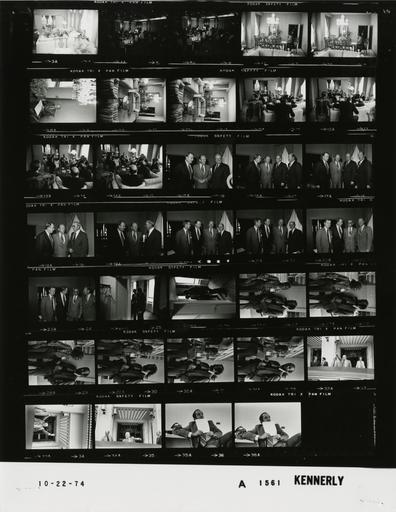 | Keywords: Ford A1561 NLGRF photo contact sheet (1974-10-22)(Gerald Ford Library).jpg White House Photographic Office WHPO is housed at the Gerald R Ford Presidential Library a branch of the National Archives and Records Administration NARA <br/><br/> This file is a 200 dpi photo contact sheet having images from roll of film A1561 of the August 9 1974 - January 20 1977 Gerald R Ford White House Photographic Office Series A0001-A9999 and B0001-B2886 photographs <br/><br/> The date on the photo contact sheet is the date the roll of film was processed not necessarily the date the photographs were taken See table below for additional details 1974-10-22 Gerald R Ford Presidential Library Image http //www fordlibrarymuseum gov/library/whphotos/A1561_NLGRF jpg A1561_NLGRF jpg from http //www fordlibrarymuseum gov/library/whphotos/19741022whpo pdf White House Photographs October 22 1974 of the http //www fordlibrarymuseum gov/Library/whphotos/whpo asp White House Photographic Collection page White House Photographic Office WHPO <br/> Creator David Hume Kennerly PD-USGov Institution Institution Gerald R Ford Presidential Library Table wikitable sortable + Photo contact sheet A1561 U S President Ford Administration Gerald R Ford Library Frame s Tone Subject proper Subject generic Names Geographic Location Photographer Date - 3A BW Prior to Fundraising Breakfast for Senator Bellmon - Oklahoma City Oklahoma seated on couch reading smoking pipe GRF Oklahoma City OK Skirvin Plaza Hotel - President's Suite Kennerly 1974-10-22 - 4A-5A BW Fundraising Breakfast for Senator Bellmon; United States Senators from Oklahoma OK - Oklahoma City Oklahoma seated at table - all not in every frame GRF Sens Bellmon Bartlett; Bill Flint Mary Morey Ed Mahzahn Rita Moore Bill Payne James Inhofe Others Oklahoma City OK Skirvin Plaza Hotel - 14th Floor Kennerly 1974-10-22 - 6A-10A BW Prior to Meeting with Representatives of the Cattle Industry; United States Senators from Oklahoma OK -Oklahoma City Oklahoma seated at table reading documents - various angles and distances GRF Oklahoma City OK Skirvin Plaza Hotel - President's Suite Kennerly 1974-10-22 - 11A-14A BW Meeting with Representatives of the Cattle Industry; United States Senators from Oklahoma OK -Oklahoma City Oklahoma seated around table - various angles and distances GRF Sens Bellmon Bartlett; George Stone Lewis Munn Wray Finney John Dunn Adam Sallee Oklahoma City OK Skirvin Plaza Hotel - Room 916 Kennerly 1974-10-22 - 15A-23A BW Following Meeting with Representatives of the Cattle Industry - Oklahoma City Oklahoma handshaking standing posing for pictures - all not in every frame GRF George Stone Lewis Munn Wray Finney John Dunn Adam Sallee Oklahoma City OK Skirvin Plaza Hotel - Room 916 Kennerly 1974-10-22 - 24A-25A BW Following Meeting with Representatives of the Cattle Industry - Oklahoma City Oklahoma standing talking Rumsfeld Burch Oklahoma City OK Skirvin Plaza Hotel - Outside Room 916 Kennerly 1974-10-22 - 26A-31A BW Prior to Departure for Myriad Convention Center -Oklahoma City Oklahoma standing talking laughing - waiting for GRF to exit building Kennerly Media Woman Oklahoma City OK Skirvin Plaza Hotel - Outside Kennerly 1974-10-22 - 32A-34A BW Prior to Departure for Myriad Convention Center -Oklahoma City Oklahoma GRF waving entering limousine; limousine roof in foreground GRF Secret Service Oklahoma City OK Skirvin Plaza Hotel - Outside Kennerly 1974-10-22 - 35A-36A BW Prior to Rally for Oklahoma Campaign Workers -Oklahoma City Oklahoma seated holding documents up to face Nessen Oklahoma City OK Myriad Convention Center Kennerly 1974-10-22 Gerald R Ford Presidential Library and Museum-cooperation PD-USGov Contact sheets by the Ford White House October 1974 Photographs by David Hume Kennerly from 1974 |