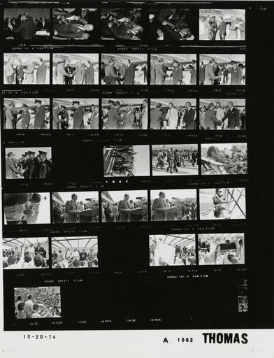 Keywords: Ford A1562 NLGRF photo contact sheet (1974-10-19)(Gerald Ford Library).jpg White House Photographic Office WHPO is housed at the Gerald R Ford Presidential Library a branch of the National Archives and Records Administration NARA <br/><br/> This file is a 200 dpi photo contact sheet having images from roll of film A1562 of the August 9 1974 - January 20 1977 Gerald R Ford White House Photographic Office Series A0001-A9999 and B0001-B2886 photographs <br/><br/> The date on the photo contact sheet is the date the roll of film was processed not necessarily the date the photographs were taken See table below for additional details 1974-10-19 Gerald R Ford Presidential Library Image http //www fordlibrarymuseum gov/library/whphotos/A1562_NLGRF jpg A1562_NLGRF jpg from http //www fordlibrarymuseum gov/library/whphotos/19741019whpo pdf White House Photographs October 19 1974 of the http //www fordlibrarymuseum gov/Library/whphotos/whpo asp White House Photographic Collection page White House Photographic Office WHPO - Thomas PD-USGov Institution Institution Gerald R Ford Presidential Library Table wikitable sortable + Photo contact sheet A1562 U S President Ford Administration Gerald R Ford Library Frame s Tone Subject proper Subject generic Names Geographic Location Photographer Date - 4 BW Following Republican Fundraising Luncheon - Greenville South Carolina GRF hugging one student GRF female students Greenville SC Greenville Memorial Auditorium Thomas 1974-10-19 - 5-7 BW Following Republican Fundraising Luncheon - Greenville South Carolina standing posing; boy holding model elephant GRF Young Boy Greenville SC Greenville Memorial Auditorium Thomas 1974-10-19 - 8-19 BW Welcoming Committee; Governor and United States Senators from Arizona AZ ; Air Force Base Commanders; Candidate for Governor - Tucson Arizona greeting handshaking -all not in every frame GRF Gov Williams Sens Goldwater Fannin; Brig Gen Haupt Col Beggs Mr Mrs Harry Rosenzweig; Mr Mrs Russell Williams Tucson AZ Davis-Monthan Air Force Base Thomas 1974-10-21 - 20 BW Thomas 1974-10-21 - 21-22 BW Arrival for Trip to Arizona - Tucson Arizona walking GRF waving GRF Others Tucson AZ Davis-Monthan Air Force Base Thomas 1974-10-21 - 23 BW Trip to United States - Mexico Border; President of Mexico - Nogales Arizona standing near microphones; right side profiles GRF Luis Echeverria Others Nogales AZ Downtown Street Thomas 1974-10-21 - 24 BW Trip to United States - Mexico Border; President of Mexico - Nogales Arizona standing handshaking smiling GRF Luis Echeverria Nogales AZ Downtown Street Thomas 1974-10-21 - 25-27 BW Trip to United States - Mexico Border; President of Mexico - Nogales Arizona GRF speaking at podium; Echeverria and others standing in background GRF Luis Echeverria Others Nogales AZ Platform Thomas 1974-10-21 - 28-30 BW Trip to Mexico; President of Mexico; Mayor of Magdalena standing waving GRF Luis Echeverria Alicia Arelland Tapia de Pavlovitch Others Magdalena Mexico La Plaza Del Padre Kino Thomas 1974-10-21 - 31 BW Thomas 1974-10-21 - 32-33 BW Trip to Mexico; President of Mexico; Mayor of Magdalena standing waving GRF Luis Echeverria Alicia Arelland Tapia de Pavlovitch Others Magdalena Mexico La Plaza Del Padre Kino Thomas 1974-10-21 - 34 BW Trip to Mexico; President of Mexico; Mayor of Magdalena GRF speaking at podium backs to camera; crowd below in plaza GRF Luis Echeverria Alicia Arelland Tapia de Pavlovitch Crowd Magdalena Mexico La Plaza Del Padre Kino Thomas 1974-10-21 Gerald R Ford Presidential Library and Museum-cooperation PD-USGov Contact sheets by the Ford White House October 1974 |