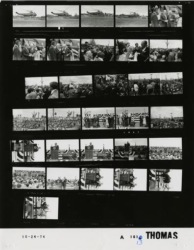 | Keywords: Ford A1613 NLGRF photo contact sheet (1974-10-24)(Gerald Ford Library).jpg White House Photographic Office WHPO is housed at the Gerald R Ford Presidential Library a branch of the National Archives and Records Administration NARA <br/><br/> This file is a 200 dpi photo contact sheet having images from roll of film A1613 of the August 9 1974 - January 20 1977 Gerald R Ford White House Photographic Office Series A0001-A9999 and B0001-B2886 photographs <br/><br/> The date on the photo contact sheet is the date the roll of film was processed not necessarily the date the photographs were taken See table below for additional details 1974-10-24 Gerald R Ford Presidential Library Image http //www fordlibrarymuseum gov/library/whphotos/A1613_NLGRF jpg A1613_NLGRF jpg from http //www fordlibrarymuseum gov/library/whphotos/19741024whpo pdf White House Photographs October 24 1974 of the http //www fordlibrarymuseum gov/Library/whphotos/whpo asp White House Photographic Collection page White House Photographic Office WHPO - Thomas PD-USGov Institution Institution Gerald R Ford Presidential Library Table wikitable sortable + Photo contact sheet A1613 U S President Ford Administration Gerald R Ford Library Frame s Tone Subject proper Subject generic Names Geographic Location Photographer Date - 3-6 BW Arrival for Honor Les Arends Day ; United States Representative from Illinois IL -Melvin Illinois landing sequence; copter Marine One Melvin IL Melvin City Little League Park Thomas 1974-10-24 - 7-9 BW Arrival for Honor Les Arends Day ; Governor and United States Representative from Illinois IL ; Widow of former United States Senator from Illinois - Melvin Illinois greeting handshaking; Marine One in background; copter GRF Louella Dirksen Rep Mrs Arends Gov Walker Melvin IL Melvin City Little League Park Thomas 1974-10-24 - 10-19 BW Arrival for Honor Les Arends Day Celebration - Melvin Illinois greeting handshaking mingling -various angles and distances GRF Secret Service Crowd Melvin IL Ford County Fairgrounds Thomas 1974-10-24 - 20 BW Honor Les Arends Day ; United States Representative from Illinois IL - Melvin Illinois GRF and Arends handshaking near podium GRF Louella Dirksen Rep Mrs Arends Gov Walker Platform Guests Crowd Melvin IL Ford County Fairgrounds Thomas 1974-10-24 - 21-28 BW Honor Les Arends Day ; Governor and United States Representative from Illinois IL ; Widow of former United States Senator from Illinois -Melvin Illinois GRF at podium speaking various angles and distances; all not in every frame GRF Louella Dirksen Rep Mrs Arends Gov Walker Platform Guests Crowd Melvin IL Ford County Fairgrounds Thomas 1974-10-24 - 29-33 BW Honor Les Arends Day ; Governor and United States Representative from Illinois IL ; Widow of former United States Senator from Illinois -Melvin Illinois GRF presenting commemorative plaque to Arends; all others standing applauding GRF Louella Dirksen Rep Mrs Arends Gov Walker Platform Guests Crowd Melvin IL Ford County Fairgrounds Thomas 1974-10-24 Gerald R Ford Presidential Library and Museum-cooperation PD-USGov Contact sheets by the Ford White House October 1974 |