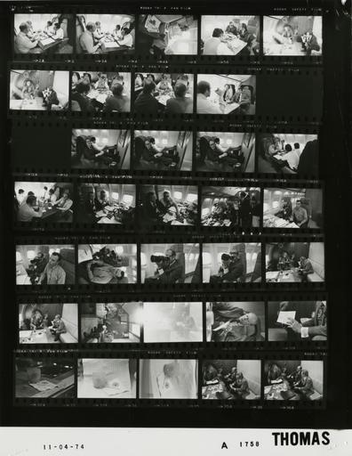 | Keywords: Ford A1758 NLGRF photo contact sheet (1974-11-02)(Gerald Ford Library).jpg White House Photographic Office WHPO is housed at the Gerald R Ford Presidential Library a branch of the National Archives and Records Administration NARA <br/><br/> This file is a 200 dpi photo contact sheet having images from roll of film A1758 of the August 9 1974 - January 20 1977 Gerald R Ford White House Photographic Office Series A0001-A9999 and B0001-B2886 photographs <br/><br/> The date on the photo contact sheet is the date the roll of film was processed not necessarily the date the photographs were taken See table below for additional details 1974-11-02 Gerald R Ford Presidential Library Image http //www fordlibrarymuseum gov/library/whphotos/A1758_NLGRF jpg A1758_NLGRF jpg from http //www fordlibrarymuseum gov/library/whphotos/19741102whpo pdf White House Photographs November 2 1974 of the http //www fordlibrarymuseum gov/Library/whphotos/whpo asp White House Photographic Collection page White House Photographic Office WHPO - Thomas PD-USGov Institution Institution Gerald R Ford Presidential Library Table wikitable sortable + Photo contact sheet A1758 U S President Ford Administration Gerald R Ford Library Frame s Tone Subject proper Subject generic Names Geographic Location Photographer Date - 31A BW Flight from Wichita Kansas to Andrews Air Force Base Hartmann's hand holding menu Hartmann Air Force One - President's Cabin Thomas 1974-11-02 - 2A-3A BW Flight from Wichita Kansas to Andrews Air Force Base seated at table talking Keiser Three Secret Service Air Force One Thomas 1974-11-02 - 4A BW Flight from Wichita Kansas to Andrews Air Force Base seated at table under blanket Lukash Air Force One Thomas 1974-11-02 - 5A BW Flight from Wichita Kansas to Andrews Air Force Base seated at table talking Korologos Burch Nessen Air Force One Thomas 1974-11-02 - 6A-7A BW Flight from Wichita Kansas to Andrews Air Force Base seated talking GRF Cheney Air Force One - President's Cabin Thomas 1974-11-02 - 8A-9A BW Flight from Wichita Kansas to Andrews Air Force Base seated at table talking; only Korologos facing camera Korologos Burch Nessen Air Force One Thomas 1974-11-02 - 10A BW Flight from Wichita Kansas to Andrews Air Force Base seated at table talking Rustand Cavaney O'Donnell Air Force One Thomas 1974-11-02 - 11A-12A BW Thomas 1974-11-02 - 13A-15A BW Flight from Wichita Kansas to Andrews Air Force Base seated talking Orben Gwen Anderson Air Force One Thomas 1974-11-02 - 16A BW Flight from Wichita Kansas to Andrews Air Force Base seated at table talking; Keiser on telephone Keiser Three Secret Service Air Force One Thomas 1974-11-02 - 17A-19A BW Flight from Wichita Kansas to Andrews Air Force Base seated talking; all not in every frame Secret Service Media Air Force One Thomas 1974-11-02 - 20A BW Flight from Wichita Kansas to Andrews Air Force Base -UPI Correspondent Nessen standing others seated; talking Nessen Dick Growald Media Air Force One Thomas 1974-11-02 - 21A-23A BW Flight from Wichita Kansas to Andrews Air Force Base seated; Burch holding camera with telephoto lens Burch Sardo Air Force One Thomas 1974-11-02 - 24A-25A BW Flight from Wichita Kansas to Andrews Air Force Base seated; holding camera with telephoto lens Burch Air Force One Thomas 1974-11-02 - 26A-29A BW Flight from Wichita Kansas to Andrews Air Force Base GRF seated at table Hartmann on sofa; talking; GRF smoking pipe GRF Hartmann Air Force One - President's Cabin Thomas 1974-11-02 - 30A BW Flight from Wichita Kansas to Andrews Air Force Base seated at table reading document GRF Air Force One - President's Cabin Thomas 1974-11-02 - 32A-34A BW Flight from Wichita Kansas to Andrews Air Force Base Drink Glass and Air Force One napkin Air Force One - President's Cabin Thomas 1974-11-02 - 35A-36A BW Flight from Wichita Kansas to Andrews Air Force Base GRF seated at table others on sofa; talking GRF Orben Hartmann Air Force One - President's Cabin Thomas 1974-11-02 Gerald R Ford Presidential Library and Museum-cooperation PD-USGov Contact sheets by the Ford White House November 1974 |