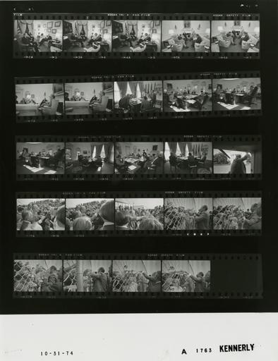 Keywords: Ford A1763 NLGRF photo contact sheet (1974-10-30)(Gerald Ford Library).jpg White House Photographic Office WHPO is housed at the Gerald R Ford Presidential Library a branch of the National Archives and Records Administration NARA <br/><br/> This file is a 200 dpi photo contact sheet having images from roll of film A1763 of the August 9 1974 - January 20 1977 Gerald R Ford White House Photographic Office Series A0001-A9999 and B0001-B2886 photographs <br/><br/> The date on the photo contact sheet is the date the roll of film was processed not necessarily the date the photographs were taken See table below for additional details 1974-10-30 Gerald R Ford Presidential Library Image http //www fordlibrarymuseum gov/library/whphotos/A1763_NLGRF jpg A1763_NLGRF jpg from http //www fordlibrarymuseum gov/library/whphotos/19741030whpo pdf White House Photographs October 30 1974 of the http //www fordlibrarymuseum gov/Library/whphotos/whpo asp White House Photographic Collection page White House Photographic Office WHPO <br/> Creator David Hume Kennerly PD-USGov Institution Institution Gerald R Ford Presidential Library Table wikitable sortable + Photo contact sheet A1763 U S President Ford Administration Gerald R Ford Library Frame s Tone Subject proper Subject generic Names Geographic Location Photographer Date - 2A-4A BW Visit to Doctor -Mrs Ford's Surgeon seated talking GRF Betty Ford Lukash Dr Prouty Ground Floor -Physician's Office Kennerly 1974-10-30 - 5A-8A BW Meeting to Discuss Negotiations Between Bituminous Coal Operators Association BCOA and the United Mine Workers UMW - President and General Counsel BCOA seated near fireplace; various angles and distances; all not in every frame GRF Sec Usery Nicholas Camicia Guy Farmer Raoul-Duval Oval Office Kennerly 1974-10-31 - 9A-15A BW Meeting to Discuss Department of Defense Budget Reductions seated around desk; various angles and distances GRF Sec Schlesinger Ash Donald Ogilvie Scowcroft O'Donnell Oval Office Kennerly 1974-10-31 - 16A BW Prior to Flight to Andrews Air Force Base waving from Marine One; taken from inside helicopter; White House in background GRF South Lawn Kennerly 1974-10-31 - 17A-25A BW Arrival for Campaign Trip to Iowa - Sioux City Iowa greeting handshaking GRF Crowd Sioux City IA Sioux City Municipal Airport Kennerly 1974-10-31 Gerald R Ford Presidential Library and Museum-cooperation PD-USGov Contact sheets by the Ford White House October 1974 Photographs by David Hume Kennerly from 1974