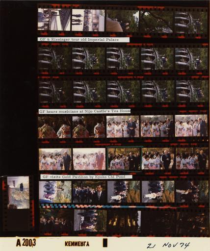 | Keywords: Ford A2003 NLGRF photo contact sheet (1974-11-21)(Gerald Ford Library).jpg White House Photographic Office WHPO is housed at the Gerald R Ford Presidential Library a branch of the National Archives and Records Administration NARA <br/><br/> This file is a 200 dpi photo contact sheet having images from roll of film A2003 of the August 9 1974 - January 20 1977 Gerald R Ford White House Photographic Office Series A0001-A9999 and B0001-B2886 photographs <br/><br/> The date on the photo contact sheet is the date the roll of film was processed not necessarily the date the photographs were taken See table below for additional details 1974-11-21 Gerald R Ford Presidential Library Image http //www fordlibrarymuseum gov/library/whphotos/A2003_NLGRF jpg A2003_NLGRF jpg from http //www fordlibrarymuseum gov/library/whphotos/19741121whpo pdf White House Photographs November 21 1974 of the http //www fordlibrarymuseum gov/Library/whphotos/whpo asp White House Photographic Collection page White House Photographic Office WHPO <br/> Creator David Hume Kennerly PD-USGov Institution Institution Gerald R Ford Presidential Library Table wikitable sortable + Photo contact sheet A2003 U S President Ford Administration Gerald R Ford Library Frame s Tone Subject proper Subject generic Names Geographic Location Photographer Date - 2-3 Color Trip to Japan - 1st Visit to Japan by Sitting U S President - Tour of Old Imperial Palace - Director of the Imperial Household in Kyoto - Local Time standing talking GRF Tadashi Ishikawa Interpreter Kyoto Japan Old Imperial Palace Kennerly 1974-11-21 - 4-16 Color Trip to Japan - 1st Visit to Japan by Sitting U S President - Tour of Old Imperial Palace - Director of the Imperial Household in Kyoto - Local Time standing on bridge looking at fish - all not in every frame GRF Kissinger Tadashi Ishikawa Kyoto Japan Old Imperial Palace - Kiaki-Bashi Bridge Kennerly 1974-11-21 - 17-18 Color Trip to Japan - 1st Visit to Japan by Sitting U S President - Tour of Residence for Shogun Rulers - Local Time GRF facing camera watching musicians perform GRF Musicians Kyoto Japan Nijo Castle -Seiryuuen Garden Area Kennerly 1974-11-21 - 19-26 Color Trip to Japan - 1st Visit to Japan by Sitting U S President - Tour of Residence for Shogun Rulers - Local Time walking; women carrying small American Flags GRF Women Kyoto Japan Nijo Castle -Seiryuuen Garden Area Kennerly 1974-11-21 - 27-33 Color Trip to Japan - 1st Visit to Japan by Sitting U S President - Tour of Zen Buddhist Shrine - Local Time walking along path to Pavilion GRF Others Kyoto Japan Kinkakuji Castle Gold Pavilion Kennerly 1974-11-21 - 34 Color Trip to Japan - 1st Visit to Japan by Sitting U S President - Tour of Zen Buddhist Shrine - Local Time Kyoto Japan Kinkakuji Castle Gold Pavilion Kennerly 1974-11-21 - 35-36 Color Trip to Japan - 1st Visit to Japan by Sitting U S President - Tour of Zen Buddhist Shrine - Abbott of Gold Pavilion - Local Time standing talking GRF Jikai Murakami Kyoto Japan Kinkakuji Castle Gold Pavilion Kennerly 1974-11-21 - 37 Color Trip to Japan - 1st Visit to Japan by Sitting U S President - Tour of Zen Buddhist Shrine - Abbott of Gold Pavilion - Local Time standing posing next to pavilion Jikai Murakami Kyoto Japan Kinkakuji Castle Gold Pavilion Kennerly 1974-11-21 Gerald R Ford Presidential Library and Museum-cooperation PD-USGov Contact sheets by the Ford White House November 1974 Photographs by David Hume Kennerly from 1974 |