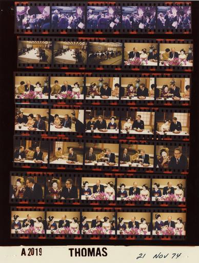| Keywords: Ford A2019 NLGRF photo contact sheet (1974-11-21)(Gerald Ford Library).jpg White House Photographic Office WHPO is housed at the Gerald R Ford Presidential Library a branch of the National Archives and Records Administration NARA <br/><br/> This file is a 200 dpi photo contact sheet having images from roll of film A2019 of the August 9 1974 - January 20 1977 Gerald R Ford White House Photographic Office Series A0001-A9999 and B0001-B2886 photographs <br/><br/> The date on the photo contact sheet is the date the roll of film was processed not necessarily the date the photographs were taken See table below for additional details 1974-11-21 Gerald R Ford Presidential Library Image http //www fordlibrarymuseum gov/library/whphotos/A2019_NLGRF jpg A2019_NLGRF jpg from http //www fordlibrarymuseum gov/library/whphotos/19741121whpo pdf White House Photographs November 21 1974 of the http //www fordlibrarymuseum gov/Library/whphotos/whpo asp White House Photographic Collection page White House Photographic Office WHPO - Thomas PD-USGov Institution Institution Gerald R Ford Presidential Library Table wikitable sortable + Photo contact sheet A2019 U S President Ford Administration Gerald R Ford Library Frame s Tone Subject proper Subject generic Names Geographic Location Photographer Date - 2A-6A Color Trip to Japan - 1st Visit to Japan by Sitting U S President - Tour of Zen Buddhist Shrine -Abbott of Gold Pavilion - Local Time standing talking greeting handshaking - many in crowd holding American Flags GRF Jikai Murakami Crowd Kyoto Japan Kinkakuji Castle Gold Pavilion Thomas 1974-11-21 - 7A-9A Color Trip to Japan - 1st Visit to Japan by Sitting U S President - Informal Dinner Hosted by Ambassador Ushiba - Local Time seated on low chairs around long table GRF Kissinger Rumsfeld Nessen Ambs Ushiba Catto Hodgson Scowcroft Hartmann Geisha Girls Others Kyoto Japan Tsuruya Restaurant Thomas 1974-11-21 - 10A-28A Color Trip to Japan - 1st Visit to Japan by Sitting U S President - Informal Dinner Hosted by Ambassador Ushiba - Local Time seated on low chairs around long table - close-ups all not in every frame GRF Kissinger Rumsfeld Nessen Ambs Ushiba Catto Hodgson Scowcroft Hartmann Hushen Geisha Girls Others Kyoto Japan Tsuruya Restaurant Thomas 1974-11-21 - 29A-36A Color Trip to Japan - 1st Visit to Japan by Sitting U S President - Informal Dinner Hosted by Ambassador Ushiba - Local Time seated on low chairs around long table - GRF holding smoking pipe in several frames GRF Geisha Girls Kyoto Japan Tsuruya Restaurant Thomas 1974-11-21 Gerald R Ford Presidential Library and Museum-cooperation PD-USGov Contact sheets by the Ford White House November 1974 |
