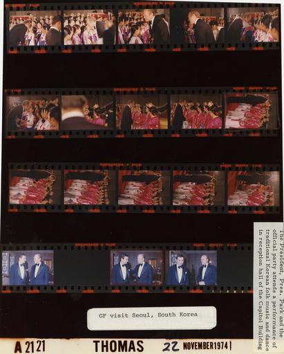 | Keywords: Ford A2121 NLGRF photo contact sheet (1974-11-22)(Gerald Ford Library).jpg White House Photographic Office WHPO is housed at the Gerald R Ford Presidential Library a branch of the National Archives and Records Administration NARA <br/><br/> This file is a 200 dpi photo contact sheet having images from roll of film A2121 of the August 9 1974 - January 20 1977 Gerald R Ford White House Photographic Office Series A0001-A9999 and B0001-B2886 photographs <br/><br/> The date on the photo contact sheet is the date the roll of film was processed not necessarily the date the photographs were taken See table below for additional details 1974-11-22 Gerald R Ford Presidential Library Image http //www fordlibrarymuseum gov/library/whphotos/A2121_NLGRF jpg A2121_NLGRF jpg from http //www fordlibrarymuseum gov/library/whphotos/19741122whpo pdf White House Photographs November 22 1974 of the http //www fordlibrarymuseum gov/Library/whphotos/whpo asp White House Photographic Collection page White House Photographic Office WHPO - Thomas PD-USGov Institution Institution Gerald R Ford Presidential Library Table wikitable sortable + Photo contact sheet A2121 U S President Ford Administration Gerald R Ford Library Frame s Tone Subject proper Subject generic Names Geographic Location Photographer Date - 2-7 Color Trip to the Republic of Korea - Following Entertainment Portion of State Dinner Hosted by President - Local Time greeting handshaking standing talking - children in traditional costumes; formal wear GRF Korean Children Others Seoul South Korea Capitol Building -Reception Hall Thomas 1974-11-22 - 8 Color Trip to the Republic of Korea - Following Entertainment Portion of State Dinner Hosted by President - Local Time greeting handshaking standing talking - head in photo; formal wear GRF Korean Performers Others Seoul South Korea Capitol Building -Reception Hall Thomas 1974-11-22 - 9-16 Color Trip to the Republic of Korea - Following Entertainment Portion of State Dinner Hosted by President - Local Time greeting handshaking standing talking - women in traditional costumes - various distances; formal wear GRF Korean Performers Others Seoul South Korea Capitol Building -Reception Hall Thomas 1974-11-22 - 17 Color Trip to the Republic of Korea - Following State Dinner Hosted by President - Local Time standing talking smiling; formal wear GRF Todd Seoul South Korea Capitol Building -Reception Hall Thomas 1974-11-22 - 18 Color Seoul South Korea Thomas 1974-11-22 - 19-20 Color Trip to the Republic of Korea - Following State Dinner Hosted by President - Local Time standing talking smiling; formal wear GRF Todd Seoul South Korea Capitol Building -Reception Hall Thomas 1974-11-22 Gerald R Ford Presidential Library and Museum-cooperation PD-USGov Contact sheets by the Ford White House November 1974 |