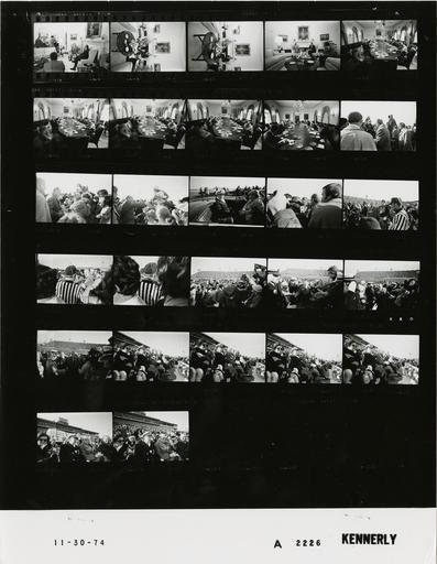 | Keywords: Ford A2226 NLGRF photo contact sheet (1974-11-30)(Gerald Ford Library).jpg  White House Photographic Office WHPO is housed at the Gerald R Ford Presidential Library a branch of the National Archives and Records Administration NARA <br/><br/> This file is a 200 dpi photo contact sheet having images from roll of film A2226 of the August 9 1974 - January 20 1977 Gerald R Ford White House Photographic Office Series A0001-A9999 and B0001-B2886 photographs <br/><br/> The date on the photo contact sheet is the date the roll of film was processed not necessarily the date the photographs were taken See table below for additional details 1974-11-30 Gerald R Ford Presidential Library Image http //www fordlibrarymuseum gov/library/whphotos/A2226_NLGRF jpg A2226_NLGRF jpg from http //www fordlibrarymuseum gov/library/whphotos/19741130whpo pdf White House Photographs November 30 1974 of the http //www fordlibrarymuseum gov/Library/whphotos/whpo asp White House Photographic Collection page White House Photographic Office WHPO <br/> Creator David Hume Kennerly PD-USGov Institution Institution Gerald R Ford Presidential Library Table wikitable sortable + Photo contact sheet A2226 U S President Ford Administration Gerald R Ford Library Frame s Tone Subject proper Subject generic Names Geographic Location Photographer Date - 1A-4A BW U S Senator from Louisiana LA seated near fireplace -all not in every frame GRF Sen Long Korologos Media Oval Office Kennerly 1974-11-30 - 5A-9A BW Meeting to Discuss General Revenue Sharing seated around table; all may not be in every frame GRF Simon O'Neill Greenspan Schmults Watt Seidman Marsh Hartmann Timmons Cole Falk Scott Cabinet Room Kennerly 1974-11-30 - 10A-12A BW Arrival for 75th Army-Navy Football Game -Philadelphia Pennsylvania greeting handshaking GRF Crowd Philadelphia PA United States Naval Base Helipad Kennerly 1974-11-30 - 13A BW Arrival for 75th Army-Navy Football Game Philadelphia Pennsylvania seated in open automobile; wearing uniform Lukash Philadelphia PA United States Naval Base Helipad Kennerly 1974-11-30 - 14A-17A BW Arrival for 75th Army-Navy Football Game Captains Navy Football Team; Captain Army Football Team - Philadelphia Pennsylvania standing for coin toss presentation of commemorative medallion GRF Cliff Collier Tim Harden Robert Johnson Game Officials Philadelphia PA John F Kennedy Stadium Kennerly 1974-11-30 - 18A-21A BW Arrival for 75th Army-Navy Football Game Philadelphia Pennsylvania greeting handshaking; GRF walking to seat on Navy side of field GRF Crowd Philadelphia PA John F Kennedy Stadium Kennerly 1974-11-30 - 22A-27A BW 75th Army-Navy Football Game - Naval Academy Superintendent; Secretary of the Navy - Philadelphia Pennsylvania seated on Navy side of field watching game - all not in every frame GRF Vice Adm William Mack J William Middendorf Others Philadelphia PA John F Kennedy Stadium Kennerly 1974-11-30 Gerald R Ford Presidential Library and Museum-cooperation PD-USGov Contact sheets by the Ford White House November 1974 Photographs by David Hume Kennerly from 1974 |