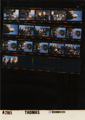 Keywords: Ford A2505 NLGRF photo contact sheet (1974-12-17)(Gerald Ford Library).jpg White House Photographic Office WHPO is housed at the Gerald R Ford Presidential Library a branch of the National Archives and Records Administration NARA <br/><br/> This file is a 200 dpi photo contact sheet having images from roll of film A2505 of the August 9 1974 - January 20 1977 Gerald R Ford White House Photographic Office Series A0001-A9999 and B0001-B2886 photographs <br/><br/> The date on the photo contact sheet is the date the roll of film was processed not necessarily the date the photographs were taken See table below for additional details 1974-12-17 Gerald R Ford Presidential Library Image http //www fordlibrarymuseum gov/library/whphotos/A2505_NLGRF jpg A2505_NLGRF jpg from http //www fordlibrarymuseum gov/library/whphotos/19741217whpo pdf White House Photographs December 17 1974 of the http //www fordlibrarymuseum gov/Library/whphotos/whpo asp White House Photographic Collection page White House Photographic Office WHPO - Thomas PD-USGov Institution Institution Gerald R Ford Presidential Library Table wikitable sortable + Photo contact sheet A2505 U S President Ford Administration Gerald R Ford Library Frame s Tone Subject proper Subject generic Names Geographic Location Photographer Date - 3-4 Color Prior to the Christmas Pageant of Peace Ceremony; National Community Christmas Tree Lighting Ceremony greeting handshaking -only GRF in both frames GRF Platform Guests Washington DC Ellipse - Bandstand Thomas 1974-12-17 - 5 Color Prior to the Christmas Pageant of Peace Ceremony; National Community Christmas Tree Lighting Ceremony greeting handshaking GRF Sec Morton Washington DC Ellipse - Bandstand Thomas 1974-12-17 - 6 Color Prior to the Christmas Pageant of Peace Ceremony; National Community Christmas Tree Lighting Ceremony - Girl Scout Boy Scout standing talking GRF Camille Deppe James Williams Washington DC Ellipse - Bandstand Thomas 1974-12-17 - 7-8 Color Christmas Pageant of Peace Ceremony; National Community Christmas Tree Lighting Ceremony seated listening -close up left side profile GRF Washington DC Ellipse - Bandstand Thomas 1974-12-17 - 9-17 Color Christmas Pageant of Peace Ceremony; National Community Christmas Tree Lighting Ceremony seated talking - various angles GRF Sec Morton Camille Deppe James Williams Platform Guests Washington DC Ellipse - Bandstand Thomas 1974-12-17 - 18 Color Following Christmas Pageant of Peace Ceremony; National Community Christmas Tree Lighting Ceremony - Mayor of Washington DC standing talking GRF Mayor Washington Unidentified Man Washington DC Ellipse - Bandstand Thomas 1974-12-17 Gerald R Ford Presidential Library and Museum-cooperation PD-USGov Contact sheets by the Ford White House December 1974 |