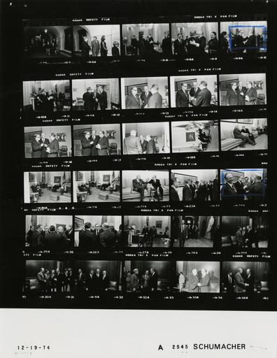 | Keywords: Ford A2545 NLGRF photo contact sheet (1974-12-19)(Gerald Ford Library).jpg White House Photographic Office WHPO is housed at the Gerald R Ford Presidential Library a branch of the National Archives and Records Administration NARA <br/><br/> This file is a 200 dpi photo contact sheet having images from roll of film A2545 of the August 9 1974 - January 20 1977 Gerald R Ford White House Photographic Office Series A0001-A9999 and B0001-B2886 photographs <br/><br/> The date on the photo contact sheet is the date the roll of film was processed not necessarily the date the photographs were taken See table below for additional details 1974-12-19 Gerald R Ford Presidential Library Image http //www fordlibrarymuseum gov/library/whphotos/A2545_NLGRF jpg A2545_NLGRF jpg from http //www fordlibrarymuseum gov/library/whphotos/19741219whpo pdf White House Photographs December 19 1974 of the http //www fordlibrarymuseum gov/Library/whphotos/whpo asp White House Photographic Collection page White House Photographic Office WHPO - Schumacher PD-USGov Institution Institution Gerald R Ford Presidential Library Table wikitable sortable + Photo contact sheet A2545 U S President Ford Administration Gerald R Ford Library Frame s Tone Subject proper Subject generic Names Geographic Location Photographer Date - 5A-6A BW Prior to Swearing-in Ceremony of Nelson Rockefeller as Vice President -Wife Sons walking towards Sen Scott's Office Rockefeller Happy Rockefeller Nelson Mark Rockefeller Washington DC United States Capitol -Corridor Schumacher 1974-12-19 - 7A-10A BW Prior to Swearing-in Ceremony of Nelson Rockefeller as Vice President embracing talking; all not in every frame GRF Rockefeller Unidentified Man Washington DC United States Capitol -Senator Scott's Office Schumacher 1974-12-19 - 11A-16A BW Prior to Swearing-in Ceremony of Nelson Rockefeller as Vice President standing talking - various angles Rockefeller GRF Sen Scott Washington DC United States Capitol -Senator Scott's Office Schumacher 1974-12-19 - 17A BW Prior to Swearing-in Ceremony of Nelson Rockefeller as Vice President standing talking - Morton's back to camera GRF Morton Laird Washington DC United States Capitol -Senator Scott's Office Schumacher 1974-12-19 - 18A BW Prior to Swearing-in Ceremony of Nelson Rockefeller as Vice President seated talking GRF Laird Washington DC United States Capitol -Senator Scott's Office Schumacher 1974-12-19 - 19A BW Prior to Swearing-in Ceremony of Nelson Rockefeller as Vice President seated talking - Morton smoking pipe Rockefeller Morton Washington DC United States Capitol -Senator Scott's Office Schumacher 1974-12-19 - 20A-21A BW Prior to Swearing-in Ceremony of Nelson Rockefeller as Vice President seated talking - on opposite sides of room Rockefeller Morton; GRF Laird Washington DC United States Capitol -Senator Scott's Office Schumacher 1974-12-19 - 22A BW Prior to Swearing-in Ceremony of Nelson Rockefeller as Vice President seated talking Rockefeller Morton Washington DC United States Capitol -Senator Scott's Office Schumacher 1974-12-19 - 23A-27A BW Arrival of Senate Escort Committee Prior to Swearing-in Ceremony of Nelson Rockefeller as Vice President greeting handshaking mingling -all not in every frame GRF Rockefeller Sens Scott Byrd Cannon Cook Javits Buckley Washington DC United States Capitol -Senator Scott's Office Schumacher 1974-12-19 - 28A BW Prior to Swearing-in Ceremony of Nelson Rockefeller as Vice President -Senate Sergeant at Arms walking towards Senate Chamber Rockefeller Sen Cannon William Wannell Washington DC United States Capitol -Corridor Schumacher 1974-12-19 - 29A-32A BW Prior to Swearing-in Ceremony of Nelson Rockefeller as Vice President greeting handshaking posing -all not in every frame GRF Others Washington DC United States Capitol -Corridor Schumacher 1974-12-19 - 33A BW Prior to Swearing-in Ceremony of Nelson Rockefeller as Vice President -Chief Justice of the Supreme Court greeting handshaking GRF Burger Washington DC United States Capitol -Corridor Schumacher 1974-12-19 - 34A BW Prior to Swearing-in Ceremony of Nelson Rockefeller as Vice President -U S Senator from New York NY greeting handshaking GRF Sen Javits Washington DC United States Capitol -Corridor Schumacher 1974-12-19 Gerald R Ford Presidential Library and Museum-cooperation PD-USGov Contact sheets by the Ford White House December 1974 |
