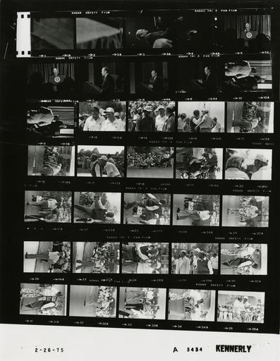 Keywords: Ford A3434 NLGRF photo contact sheet (1975-02-25)(Gerald Ford Library).jpg White House Photographic Office WHPO is housed at the Gerald R Ford Presidential Library a branch of the National Archives and Records Administration NARA <br/><br/> This file is a 200 dpi photo contact sheet having images from roll of film A3434 of the August 9 1974 - January 20 1977 Gerald R Ford White House Photographic Office Series A0001-A9999 and B0001-B2886 photographs <br/><br/> The date on the photo contact sheet is the date the roll of film was processed not necessarily the date the photographs were taken See table below for additional details 1975-02-25 Gerald R Ford Presidential Library Image http //www fordlibrarymuseum gov/library/whphotos/A3434_NLGRF jpg A3434_NLGRF jpg from http //www fordlibrarymuseum gov/library/whphotos/19750225whpo pdf White House Photographs February 25 1975 of the http //www fordlibrarymuseum gov/Library/whphotos/whpo asp White House Photographic Collection page White House Photographic Office WHPO <br/> Creator David Hume Kennerly PD-USGov Institution Institution Gerald R Ford Presidential Library Table wikitable sortable + Photo contact sheet A3434 U S President Ford Administration Gerald R Ford Library Frame s Tone Subject proper Subject generic Names Geographic Location Photographer Date - 1-11 BW Women's Forum on National Security GRF at podium; various distances GRF American Legion Ladies Auxiliary Washington DC Washington Hilton Hotel - International Ballroom Kennerly 1975-02-25 - 12-35 BW Trip to Florida - Jackie Gleason Inverrary Classic Celebrities Golf Tournament - Hollywood Florida standing talking performing various golf activities; all not in every frame; golf attire GRF Jackie Gleason Craig Gleason Marilyn Horwich John Montgomery Jack Gaines Eugene Scott Joseph King Jack Nicklaus Bob Hope Elliott Kahn Gleen Zakany Hollywood FL Inverrary Country Club Kennerly 1975-02-26 Gerald R Ford Presidential Library and Museum-cooperation PD-USGov Contact sheets by the Ford White House February 1975 Photographs by David Hume Kennerly from 1975 |