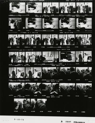 Keywords: Ford A3597 NLGRF photo contact sheet (1975-03-10)(Gerald Ford Library).jpg White House Photographic Office WHPO is housed at the Gerald R Ford Presidential Library a branch of the National Archives and Records Administration NARA <br/><br/> This file is a 200 dpi photo contact sheet having images from roll of film A3597 of the August 9 1974 - January 20 1977 Gerald R Ford White House Photographic Office Series A0001-A9999 and B0001-B2886 photographs <br/><br/> The date on the photo contact sheet is the date the roll of film was processed not necessarily the date the photographs were taken See table below for additional details 1975-03-10 Gerald R Ford Presidential Library Image http //www fordlibrarymuseum gov/library/whphotos/A3597_NLGRF jpg A3597_NLGRF jpg from http //www fordlibrarymuseum gov/library/whphotos/19750310whpo pdf White House Photographs March 10 1975 of the http //www fordlibrarymuseum gov/Library/whphotos/whpo asp White House Photographic Collection page White House Photographic Office WHPO - Fitz-Patrick PD-USGov Institution Institution Gerald R Ford Presidential Library Table wikitable sortable + Photo contact sheet A3597 U S President Ford Administration Gerald R Ford Library Frame s Tone Subject proper Subject generic Names Geographic Location Photographer Date - 3 BW Prior to Swearing in of Secretary of Housing and Urban Development standing talking Carla Hills Roderick Hills Sr Rockefeller Red Room Fitz-Patrick 1975-03-10 - 4-18 BW Swearing in of Secretary of Housing and Urban Development standing on stage; long shots; all not in every frame GRF Carla Hills Roderick Hills Sr ; Alison Laura Megan Rick Hills; Justice Byron White Rockefeller Others East Room Fitz-Patrick 1975-03-10 - 19-20 BW Swearing in of Secretary of Housing and Urban Development Carla Hills at lectern speaking; others behind GRF Carla Hills Roderick Hills Sr ; Alison Laura Megan Rick Hills; Justice Byron White Rockefeller Others East Room Fitz-Patrick 1975-03-10 - 21 BW Swearing in of Secretary of Housing and Urban Development standing listening GRF Rockefeller Hills Daughter East Room Fitz-Patrick 1975-03-10 - 22-24 BW Swearing in of Secretary of Housing and Urban Development GRF and C Hills handshaking; R Hills in background applaudimg GRF C Hills R Hills East Room Fitz-Patrick 1975-03-10 - 25-34 BW Following Swearing in of Secretary of Housing and Urban Development greeting handshaking stanfing talking; all not in every frame Rockefeller Brennan Burns Armstrong Others East Room Fitz-Patrick 1975-03-10 Gerald R Ford Presidential Library and Museum-cooperation PD-USGov Contact sheets by the Ford White House March 1975 |
