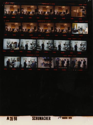 Keywords: Ford A3598 NLGRF photo contact sheet (1975-03-10)(Gerald Ford Library).jpg White House Photographic Office WHPO is housed at the Gerald R Ford Presidential Library a branch of the National Archives and Records Administration NARA <br/><br/> This file is a 200 dpi photo contact sheet having images from roll of film A3598 of the August 9 1974 - January 20 1977 Gerald R Ford White House Photographic Office Series A0001-A9999 and B0001-B2886 photographs <br/><br/> The date on the photo contact sheet is the date the roll of film was processed not necessarily the date the photographs were taken See table below for additional details 1975-03-10 Gerald R Ford Presidential Library Image http //www fordlibrarymuseum gov/library/whphotos/A3598_NLGRF jpg A3598_NLGRF jpg from http //www fordlibrarymuseum gov/library/whphotos/19750310whpo pdf White House Photographs March 10 1975 of the http //www fordlibrarymuseum gov/Library/whphotos/whpo asp White House Photographic Collection page White House Photographic Office WHPO - Schumacher PD-USGov Institution Institution Gerald R Ford Presidential Library Table wikitable sortable + Photo contact sheet A3598 U S President Ford Administration Gerald R Ford Library Frame s Tone Subject proper Subject generic Names Geographic Location Photographer Date - 2A-10A Color Swearing in of Secretary of Housing and Urban Development Carla Hills at lectern speaking; others behin;long shots GRF Carla Hills Roderick Hills Sr ; Alison Laura Megan Rick Hills; Justice Byron White Rockefeller Others East Room Schumacher 1975-03-10 - 11A Color entering room GRF Oval Office Schumacher 1975-03-10 - 10A-21A Color Miss America 1975 Entourage all not in every frame GRF Shirley Cothran Joseph Bradway Rep Ray Roberts Doris Kelly Oval Office Schumacher 1975-03-10 Gerald R Ford Presidential Library and Museum-cooperation PD-USGov Contact sheets by the Ford White House March 1975 |