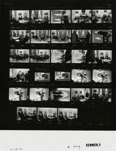 | Keywords: Ford A3716 NLGRF photo contact sheet (1975-03-19)(Gerald Ford Library).jpg  White House Photographic Office WHPO is housed at the Gerald R Ford Presidential Library a branch of the National Archives and Records Administration NARA <br/><br/> This file is a 200 dpi photo contact sheet having images from roll of film A3716 of the August 9 1974 - January 20 1977 Gerald R Ford White House Photographic Office Series A0001-A9999 and B0001-B2886 photographs <br/><br/> The date on the photo contact sheet is the date the roll of film was processed not necessarily the date the photographs were taken See table below for additional details 1975-03-19 Gerald R Ford Presidential Library Image http //www fordlibrarymuseum gov/library/whphotos/A3716_NLGRF jpg A3716_NLGRF jpg from http //www fordlibrarymuseum gov/library/whphotos/19750319whpo pdf White House Photographs March 19 1975 of the http //www fordlibrarymuseum gov/Library/whphotos/whpo asp White House Photographic Collection page White House Photographic Office WHPO <br/> Creator David Hume Kennerly PD-USGov Institution Institution Gerald R Ford Presidential Library Table wikitable sortable + Photo contact sheet A3716 U S President Ford Administration Gerald R Ford Library Frame s Tone Subject proper Subject generic Names Geographic Location Photographer Date - 1A-7A BW around desk; various angles and distances; all not in every frame GRF Hartmann Marsh Rumsfeld Friedersdorf Nessen Oval Office Kennerly 1975-03-19 - 8A-13A BW US Senator from Louisiana around desk GRF Sen Long Oval Office Kennerly 1975-03-19 - 14A-15A BW President International Brotherhood of Teamsters near fireplace GRF Dunlop Frank Fitzsimmons Oval Office Kennerly 1975-03-19 - 16A BW standing Marsh holding newspaper; Buchen and Rumsfeld in background Scowcroft Marsh Scheduling and Advance Office Kennerly 1975-03-19 - 17A-18A BW on loveseat looking in briefcase; taken through doorway Colby Scheduling and Advance Office Kennerly 1975-03-19 - 19A-22A BW standing talking Colby Rumsfeld Cabinet Room Kennerly 1975-03-19 - 23A BW standing talking Marsh Colby Scheduling and Advance Office Kennerly 1975-03-19 - 24A BW Rumsfeld Schlesinger Colby Buchen Scheduling and Advance Office Kennerly 1975-03-19 - 25A-28A BW around desk; various angles; Scowcroft in first frame GRF Colby Schlesinger Oval Office Kennerly 1975-03-19 Gerald R Ford Presidential Library and Museum-cooperation PD-USGov Contact sheets by the Ford White House March 1975 Photographs by David Hume Kennerly from 1975 |