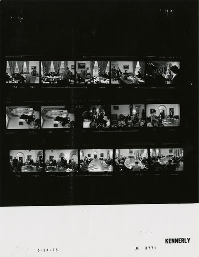 Keywords: Ford A3771 NLGRF photo contact sheet (1975-03-24)(Gerald Ford Library).jpg White House Photographic Office WHPO is housed at the Gerald R Ford Presidential Library a branch of the National Archives and Records Administration NARA <br/><br/> This file is a 200 dpi photo contact sheet having images from roll of film A3771 of the August 9 1974 - January 20 1977 Gerald R Ford White House Photographic Office Series A0001-A9999 and B0001-B2886 photographs <br/><br/> The date on the photo contact sheet is the date the roll of film was processed not necessarily the date the photographs were taken See table below for additional details 1975-03-24 Gerald R Ford Presidential Library Image http //www fordlibrarymuseum gov/library/whphotos/A3771_NLGRF jpg A3771_NLGRF jpg from http //www fordlibrarymuseum gov/library/whphotos/19750324whpo pdf White House Photographs March 24 1975 of the http //www fordlibrarymuseum gov/Library/whphotos/whpo asp White House Photographic Collection page White House Photographic Office WHPO <br/> Creator David Hume Kennerly PD-USGov Institution Institution Gerald R Ford Presidential Library Table wikitable sortable + Photo contact sheet A3771 U S President Ford Administration Gerald R Ford Library Frame s Tone Subject proper Subject generic Names Geographic Location Photographer Date - 2-5 BW moving around room; all not in every frame GRF Nessen Friedersdorf Marsh Hartmann Oval Office Kennerly 1975-03-24 - 6 BW Meeting with Romanian Choral Group sponsored by Friendship Ambassadors Inc all not in frame GRF Mr Mrs Harry Morgan Thomas Dunlop Amb Corneliu Bogdan Eugen Florescu Cyprian Porembescu Choral Group Crown of the Carpathians Folk Dance Ensemble; Others Cabinet Room Kennerly 1975-03-24 - 7-8 BW standing on telephone; back to camera Marsh Scheduling and Advance Office Kennerly 1975-03-24 - 9 BW Meeting with Romanian Choral Group sponsored by Friendship Ambassadors Inc all not in frame GRF Mr Mrs Harry Morgan Thomas Dunlop Amb Corneliu Bogdan Eugen Florescu Cyprian Porembescu Choral Group Crown of the Carpathians Folk Dance Ensemble; Others Cabinet Room Kennerly 1975-03-24 - 10 BW on sofa near fireplace GRF C Hills Oval Office Kennerly 1975-03-24 - 11-16 BW Meeting With Transition Team around table; various angles and distances; all not in every frame GRF John Byrnes William Scranton William Whyte Bryce Harlow Sen Griffin David Packard Marsh Hartmann Rumsfeld Buchen Seidman Cheney Cabinet Room Kennerly 1975-03-24 Gerald R Ford Presidential Library and Museum-cooperation PD-USGov Contact sheets by the Ford White House March 1975 Photographs by David Hume Kennerly from 1975 |