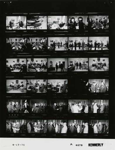 | Keywords: Ford A4079 NLGRF photo contact sheet (1975-04-17)(Gerald Ford Library).jpg  White House Photographic Office WHPO is housed at the Gerald R Ford Presidential Library a branch of the National Archives and Records Administration NARA <br/><br/> This file is a 200 dpi photo contact sheet having images from roll of film A4079 of the August 9 1974 - January 20 1977 Gerald R Ford White House Photographic Office Series A0001-A9999 and B0001-B2886 photographs <br/><br/> The date on the photo contact sheet is the date the roll of film was processed not necessarily the date the photographs were taken See table below for additional details 1975-04-17 Gerald R Ford Presidential Library Image http //www fordlibrarymuseum gov/library/whphotos/A4079_NLGRF jpg A4079_NLGRF jpg from http //www fordlibrarymuseum gov/library/whphotos/19750417whpo pdf White House Photographs April 17 1975 of the http //www fordlibrarymuseum gov/Library/whphotos/whpo asp White House Photographic Collection page White House Photographic Office WHPO <br/> Creator David Hume Kennerly PD-USGov Institution Institution Gerald R Ford Presidential Library Table wikitable sortable + Photo contact sheet A4079 U S President Ford Administration Gerald R Ford Library Frame s Tone Subject proper Subject generic Names Geographic Location Photographer Date - 1 BW greeting handshaking GRF Burns Oval Office Kennerly 1975-04-17 - 2 BW closing drawer on side table; smoking pipe GRF Oval Office Kennerly 1975-04-17 - 3 BW seated around desk; Burns speaking gesturing GRF Burns Oval Office Kennerly 1975-04-17 - 4-7 BW Economy and Energy Meeting GRF entering room smoking pipe in first frame; around table in others GRF Seidman Greenspan Morton Dunlop Burns Zarb Lynn Scowcroft Gardner Marsh Dunham Rumsfeld Nessen Raoul-Duval Zausner Cheney Carlson Porter Cabinet Room Kennerly 1975-04-17 - 8-10 BW US Senators from Arkansas AR and Oklahoma OK greeting handshaking GRF Sens McClellan Bartlett Oval Office Kennerly 1975-04-17 - 11-12 BW Meeting to Discuss S1306 Authorizing a Loan to the Chicago Rock Island and Pacific Railroad near fireplace; Coleman not seen in first frame GRF Sens McClellan Bartlett Sec Coleman Cannon Patrick O'Donnell Oval Office Kennerly 1975-04-17 - 13 BW Professor of Law Yale University standing talking Kissinger Eugene Rostow Scheduling and Advance Office Kennerly 1975-04-17 - 14 BW Professor of Law Yale University greeting handshaking GRF Eugene Rostow Oval Office Kennerly 1975-04-17 - 15-18 BW Professor of Law Yale University near fireplace; various angles and distances GRF Eugene Rostow; Kissinger Oval Office Kennerly 1975-04-17 - 19 BW Kennerly 1975-04-17 - 20-30 BW Drop-by at Party in Honor of Sen Clifford Hansen of Wyoming WY greeting handshaking standing talking; all not in every frame; GRF in formal wear GRF Betty Ford Others Washington DC University Club Kennerly 1975-04-17 Gerald R Ford Presidential Library and Museum-cooperation PD-USGov Contact sheets by the Ford White House April 1975 Photographs by David Hume Kennerly from 1975 |