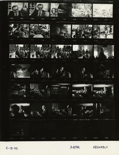 Keywords: Ford A4099 NLGRF photo contact sheet (1975-04-18)(Gerald Ford Library).jpg White House Photographic Office WHPO is housed at the Gerald R Ford Presidential Library a branch of the National Archives and Records Administration NARA <br/><br/> This file is a 200 dpi photo contact sheet having images from roll of film A4099 of the August 9 1974 - January 20 1977 Gerald R Ford White House Photographic Office Series A0001-A9999 and B0001-B2886 photographs <br/><br/> The date on the photo contact sheet is the date the roll of film was processed not necessarily the date the photographs were taken See table below for additional details 1975-04-18 Gerald R Ford Presidential Library Image http //www fordlibrarymuseum gov/library/whphotos/A4099_NLGRF jpg A4099_NLGRF jpg from http //www fordlibrarymuseum gov/library/whphotos/19750418whpo pdf White House Photographs April 18 1975 of the http //www fordlibrarymuseum gov/Library/whphotos/whpo asp White House Photographic Collection page White House Photographic Office WHPO <br/> Creator David Hume Kennerly PD-USGov Institution Institution Gerald R Ford Presidential Library Table wikitable sortable + Photo contact sheet A4099 U S President Ford Administration Gerald R Ford Library Frame s Tone Subject proper Subject generic Names Geographic Location Photographer Date - 2-4 BW seated smiling; back of GRF's head in last two frames Rockefeller Oval Office Kennerly 1975-04-18 - 5-6 BW Trip to New Hampshire -Arrival at the State House - Manchester New Hampshire GRF holding microphone speaking; crowd in background GRF Crowd Manchester NH New Hampshire State House - Outside Kennerly 1975-04-18 - 7-9 BW Trip to New Hampshire -Arrival at the State House - Manchester New Hampshire greeting handshaking GRF Crowd Manchester NH New Hampshire State House - Outside Kennerly 1975-04-18 - 10-17 BW Trip to New Hampshire -Speech Before a Joint Session of the New Hampshire State Legislature - Manchester New Hampshire GRF at podium; others standing applauding seated; various distances and angles GRF Legislators Manchester NH New Hampshire State House - House Chamber Kennerly 1975-04-18 - 18-31 BW Trip to New Hampshire -White House Conference on Domestic and Economic Affairs - Manchester New Hampshire GRF at podium speaking; Baroody in some frames; crowd not in all frames; various angles and distances GRF Crowd Manchester NH State Ballroom - Highway Hotel Kennerly 1975-04-18 - 32 BW Trip to New Hampshire -Following White House Conference on Domestic and Economic Affairs - Manchester New Hampshire walking out door Two Unidentified Men Manchester NH Outside Highway Hotel Kennerly 1975-04-18 Gerald R Ford Presidential Library and Museum-cooperation PD-USGov Contact sheets by the Ford White House April 1975 Photographs by David Hume Kennerly from 1975 |