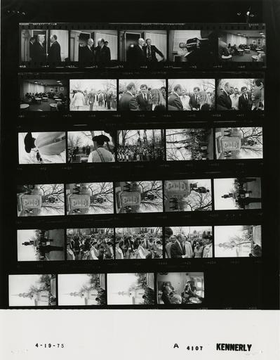 | Keywords: Ford A4107 NLGRF photo contact sheet (1975-04-18)(Gerald Ford Library).jpg White House Photographic Office WHPO is housed at the Gerald R Ford Presidential Library a branch of the National Archives and Records Administration NARA <br/><br/> This file is a 200 dpi photo contact sheet having images from roll of film A4107 of the August 9 1974 - January 20 1977 Gerald R Ford White House Photographic Office Series A0001-A9999 and B0001-B2886 photographs <br/><br/> The date on the photo contact sheet is the date the roll of film was processed not necessarily the date the photographs were taken See table below for additional details 1975-04-18 Gerald R Ford Presidential Library Image http //www fordlibrarymuseum gov/library/whphotos/A4107_NLGRF jpg A4107_NLGRF jpg from http //www fordlibrarymuseum gov/library/whphotos/19750418whpo pdf White House Photographs April 18 1975 of the http //www fordlibrarymuseum gov/Library/whphotos/whpo asp White House Photographic Collection page White House Photographic Office WHPO <br/> Creator David Hume Kennerly PD-USGov Institution Institution Gerald R Ford Presidential Library Table wikitable sortable + Photo contact sheet A4107 U S President Ford Administration Gerald R Ford Library Frame s Tone Subject proper Subject generic Names Geographic Location Photographer Date - 2-5 BW Trip to Massachusetts - Prior to the Bicentennial Ceremony of the Hanging of Paul Revere's Two Lanterns - Boston Massachusetts greeting handshaking talking GRF Rep McCormack Boston MA Old North Church - Holding Room Kennerly 1975-04-18 - 6-7 BW Trip to Massachusetts - Breakfast Meeting With State Republican Leaders - Boston Massachusetts seated talking long shots GRF Massachusetts State Republican Leaders Boston MA Colonnade Hotel - Colonnade Suite East Kennerly 1975-04-18 - 8 BW Trip to Massachusetts - Prior to Bicentennial Ceremony at Old North Bridge - Concord Massachusetts awaiting arrival of GRF Sen Kennedy; Caroline Kennedy Concord MA Near North Bridge Kennerly 1975-04-18 - 9-11 BW Trip to Massachusetts - Prior to Bicentennial Ceremony at Old North Bridge - Concord Massachusetts greeting handshaking GRF Sen Kennedy; Caroline Kennedy Concord MA Near North Bridge Kennerly 1975-04-18 - 12-13 BW Trip to Massachusetts - Bicentennial Ceremony at Old North Bridge - Concord Massachusetts GRF at podium; Guard in foreground GRF Concord Honor Guard Concord MA Near North Bridge Kennerly 1975-04-19 - 14-15 BW Trip to Massachusetts - Bicentennial Ceremony at Old North Bridge - Concord Massachusetts standing listening; some in trees Crowd Media Concord MA Near North Bridge Kennerly 1975-04-19 - 16-22 BW Trip to Massachusetts - Bicentennial Ceremony at Old North Bridge - Concord Massachusetts GRF standing near Minuteman Statue GRF Others Concord MA Near North Bridge Kennerly 1975-04-19 - 23-24 BW Trip to Massachusetts - Prior to Bicentennial Ceremony at Lexington Green - Lexington Massachusetts awaiting arrival of GRF Lexington Minute Man Company Others Lexington MA Lexington Green Kennerly 1975-04-19 - 25 BW Trip to Massachusetts - Prior to Bicentennial Ceremony at Lexington Green - Lexington Massachusetts greeting handshaking GRF Capt Mrs Robert Marrigan Lexington MA Lexington Green Kennerly 1975-04-19 - 26-29 BW Trip to Massachusetts - Bicentennial Ceremony at Lexington Green - Lexington Massachusetts GRF speaking; long shots; church spire in background GRF Crowd Lexington MA Lexington Green Kennerly 1975-04-19 - 30 BW Return Flight from Hanscom Field Bedford Massachusetts to Andrews Air Force Base seated talking GRF Sen Kennedy Rep Heckler; Hartmann Air Force One - President's Cabin Kennerly 1975-04-19 Gerald R Ford Presidential Library and Museum-cooperation PD-USGov Contact sheets by the Ford White House April 1975 Photographs by David Hume Kennerly from 1975 |