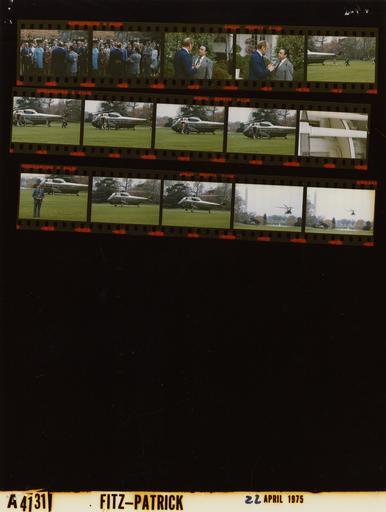 Keywords: Ford A4131 NLGRF photo contact sheet (1975-04-23)(Gerald Ford Library).jpg White House Photographic Office WHPO is housed at the Gerald R Ford Presidential Library a branch of the National Archives and Records Administration NARA <br/><br/> This file is a 200 dpi photo contact sheet having images from roll of film A4131 of the August 9 1974 - January 20 1977 Gerald R Ford White House Photographic Office Series A0001-A9999 and B0001-B2886 photographs <br/><br/> The date on the photo contact sheet is the date the roll of film was processed not necessarily the date the photographs were taken See table below for additional details 1975-04-23 Gerald R Ford Presidential Library Image http //www fordlibrarymuseum gov/library/whphotos/A4131_NLGRF jpg A4131_NLGRF jpg from http //www fordlibrarymuseum gov/library/whphotos/19750423whpo pdf White House Photographs April 23 1975 of the http //www fordlibrarymuseum gov/Library/whphotos/whpo asp White House Photographic Collection page White House Photographic Office WHPO - Fitz-Patrick PD-USGov Institution Institution Gerald R Ford Presidential Library Table wikitable sortable + Photo contact sheet A4131 U S President Ford Administration Gerald R Ford Library Frame s Tone Subject proper Subject generic Names Geographic Location Photographer Date - 4-5 Color Prior to Marine One Departure for Andrews Air Force Base standing talking; GRF back to camera arm around unidentified man GRF Unidentified Group Rose Garden Fitz-Patrick 1975-04-23 - 6-7 Color Prior to Marine One Departure for Andrews Air Force Base standing talking GRF Unidentified Man Rose Garden Fitz-Patrick 1975-04-23 - 8-12 Color Prior to Departure for Andrews Air Force Base walking toward Marine One; long shots GRF; Kennerly military South Lawn Fitz-Patrick 1975-04-23 - 13 Color Prior to GRF's Departure for Andrews Air Force Base waving; taken from ground level Betty Ford Truman Balcony Fitz-Patrick 1975-04-23 - 14 Color Prior to GRF's Departure for Andrews Air Force Base standing; Marine One in background Secret Service South Lawn Fitz-Patrick 1975-04-23 - 15-18 Color Departure for Andrews Air Force Base Marine One ascending; flying away from camera; Washington Monument in last two frames South Lawn Fitz-Patrick 1975-04-23 Gerald R Ford Presidential Library and Museum-cooperation PD-USGov Contact sheets by the Ford White House April 1975 |