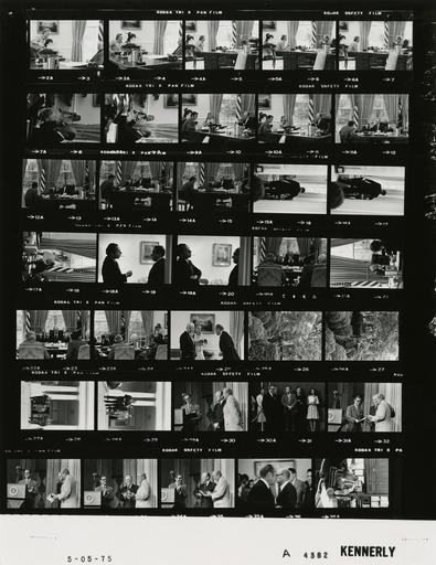 Keywords: Ford A4382 NLGRF photo contact sheet (1975-05-05)(Gerald Ford Library).jpg White House Photographic Office WHPO is housed at the Gerald R Ford Presidential Library a branch of the National Archives and Records Administration NARA <br/><br/> This file is a 200 dpi photo contact sheet having images from roll of film A4382 of the August 9 1974 - January 20 1977 Gerald R Ford White House Photographic Office Series A0001-A9999 and B0001-B2886 photographs <br/><br/> The date on the photo contact sheet is the date the roll of film was processed not necessarily the date the photographs were taken See table below for additional details 1975-05-05 Gerald R Ford Presidential Library Image http //www fordlibrarymuseum gov/library/whphotos/A4382_NLGRF jpg A4382_NLGRF jpg from http //www fordlibrarymuseum gov/library/whphotos/19750505whpo pdf White House Photographs May 5 1975 of the http //www fordlibrarymuseum gov/Library/whphotos/whpo asp White House Photographic Collection page White House Photographic Office WHPO <br/> Creator David Hume Kennerly PD-USGov Institution Institution Gerald R Ford Presidential Library Table wikitable sortable + Photo contact sheet A4382 U S President Ford Administration Gerald R Ford Library Frame s Tone Subject proper Subject generic Names Geographic Location Photographer Date - 27A-28A BW walking laughing; O'Donnell in first frame only GRF O'Donnell Lukash Secret Service White House Entrance near Treasury Building Kennerly 1975-05-05 - 29A BW Ceremony to Present Alexander Hamilton Award to Former Secretary Shultz and Portrait Unveiling standing near podium GRF Simon George Shultz Washington DC Department of the Treasury - Room 4121 Kennerly 1975-05-05 - 30A BW Ceremony to Present Alexander Hamilton Award to Former Secretary Shultz and Portrait Unveiling standing listening Kissinger Others Washington DC Department of the Treasury - Room 4121 Kennerly 1975-05-05 - 32A-35A BW Ceremony to Present Alexander Hamilton Award to Former Secretary Shultz and Portrait Unveiling standing near podium GRF Simon George Shultz Washington DC Department of the Treasury - Room 4121 Kennerly 1975-05-05 - 36A BW Ceremony to Present Alexander Hamilton Award to Former Secretary Shultz and Portrait Unveiling moving; head and shoulder profile GRF Washington DC Department of the Treasury - Room 4121 Kennerly 1975-05-05 - 37A BW seated talking on telephone; feet on table Rumsfeld Rumsfeld's Office Kennerly 1975-05-05 - 2A-6A BW seated around desk GRF Perry Young Oval Office Kennerly 1975-05-05 - 7A-8A BW GRF seated at desk; Susan in background taking photographs GRF Susan Ford Oval Office Kennerly 1975-05-05 - 9A-14A BW seated around desk; various angles; Susan Ford taking photos in two frames GRF Rumsfeld Oval Office Kennerly 1975-05-05 - 15A-16A BW walking Carrying briefcase; back to camera Kissinger Scheduling and Advance Office Kennerly 1975-05-05 - 17A BW GRF seated at desk; Susan in background taking photographs GRF Susan Ford Oval Office Kennerly 1975-05-05 - 18A-19A BW standing talking; RN with cigarette dangling from mouth Kissinger Nessen Scheduling and Advance Office Kennerly 1975-05-05 - 20A-23A BW seated around desk; taken toward GRF; all not in frames GRF Marsh Hartmann Greener Nessen Rumsfeld Friedersdorf Oval Office Kennerly 1975-05-05 - 24A BW standing talking; SF holding camera GRF Burns Susan Ford Oval Office Kennerly 1975-05-05 - 25A-26A BW walking smoking pipe Rumsfeld Garden Kennerly 1975-05-05 Gerald R Ford Presidential Library and Museum-cooperation PD-USGov Contact sheets by the Ford White House May 1975 Photographs by David Hume Kennerly from 1975