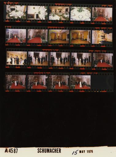 Keywords: Ford A4587 NLGRF photo contact sheet (1975-05-15)(Gerald Ford Library).jpg White House Photographic Office WHPO is housed at the Gerald R Ford Presidential Library a branch of the National Archives and Records Administration NARA <br/><br/> This file is a 200 dpi photo contact sheet having images from roll of film A4587 of the August 9 1974 - January 20 1977 Gerald R Ford White House Photographic Office Series A0001-A9999 and B0001-B2886 photographs <br/><br/> The date on the photo contact sheet is the date the roll of film was processed not necessarily the date the photographs were taken See table below for additional details 1975-05-15 Gerald R Ford Presidential Library Image http //www fordlibrarymuseum gov/library/whphotos/A4587_NLGRF jpg A4587_NLGRF jpg from http //www fordlibrarymuseum gov/library/whphotos/19750515whpo pdf White House Photographs May 15 1975 of the http //www fordlibrarymuseum gov/Library/whphotos/whpo asp White House Photographic Collection page White House Photographic Office WHPO - Schumacher PD-USGov Institution Institution Gerald R Ford Presidential Library Table wikitable sortable + Photo contact sheet A4587 U S President Ford Administration Gerald R Ford Library Frame s Tone Subject proper Subject generic Names Geographic Location Photographer Date - 2A-5A Color Preparations for State Dinner for the Shah of Iran Table settings State Dining Room Schumacher 1975-05-15 - 6A-8A Color Preparations for State Dinner for the Shah of Iran Cross Hall Schumacher 1975-05-15 - 9A-10A Color Preparations for State Dinner for the Shah of Iran East Room Schumacher 1975-05-15 - 11A-12A Color Reception Prior to State Dinner for the Shah of Iran greeting handshaking; all not in every frame; formal wear GRF Betty Ford Shah Mohammad Reza Pahlavi Shahbanou Farah Pahlavi Others Second Floor - Yellow Oval Room Schumacher 1975-05-15 - 13A-15A Color State Dinner for the Shah of Iran standing talking; formal wear GRF Betty Ford Shah Mohammad Reza Pahlavi Shahbanou Farah Pahlavi East Room Schumacher 1975-05-15 - 16A-17A Color State Dinner for the Shah of Iran walking toward State Dining Room; formal wear GRF Shahbanou Farah Pahlavi Cross Hall Schumacher 1975-05-15 - 18A-20A Color State Dinner for the Shah of Iran walking toward State Dining Room; formal wear Betty Ford Shah Mohammad Reza Pahlavi Cross Hall Schumacher 1975-05-15 Gerald R Ford Presidential Library and Museum-cooperation PD-USGov Contact sheets by the Ford White House May 1975
