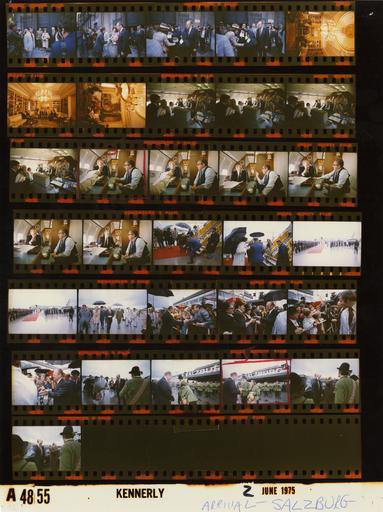 | Keywords: Ford A4855 NLGRF photo contact sheet (1975-06-01)(Gerald Ford Library).jpg White House Photographic Office WHPO is housed at the Gerald R Ford Presidential Library a branch of the National Archives and Records Administration NARA <br/><br/> This file is a 200 dpi photo contact sheet having images from roll of film A4855 of the August 9 1974 - January 20 1977 Gerald R Ford White House Photographic Office Series A0001-A9999 and B0001-B2886 photographs <br/><br/> The date on the photo contact sheet is the date the roll of film was processed not necessarily the date the photographs were taken See table below for additional details 1975-06-01 Gerald R Ford Presidential Library Image http //www fordlibrarymuseum gov/library/whphotos/A4855_NLGRF jpg A4855_NLGRF jpg from http //www fordlibrarymuseum gov/library/whphotos/19750601whpo pdf White House Photographs June 1 1975 of the http //www fordlibrarymuseum gov/Library/whphotos/whpo asp White House Photographic Collection page White House Photographic Office WHPO <br/> Creator David Hume Kennerly PD-USGov Institution Institution Gerald R Ford Presidential Library Table wikitable sortable + Photo contact sheet A4855 U S President Ford Administration Gerald R Ford Library Frame s Tone Subject proper Subject generic Names Geographic Location Photographer Date - 23 Color Trip to Austria; Arrival Ceremony at Airport walking across tarmac GRF Kreisky Others Salzburg Austria Salzburg Airport Kennerly 1975-06-01 - 2-5 Color Trip to Spain - Prior to Attending Sunday Mass greeting handshaking; all not in every frame GRF Betty Ford Fr Eniliano Perez Clergy Mother Superior of the Monastery of the Visitation; Nuns Others Madrid Spain Salesas Realas Roman Catholic Church - Outside Kennerly 1975-06-01 - 6-8 Color Trip to Spain - Farewell Visit with Generalissimo Mrs Francisco Franco seated talking; various angles and distances; all not in every frame GRF Generalissimo Francisco Franco Pedro Cortini Mauri Kissinger Others Madrid Spain Moncloa Palace - Library Kennerly 1975-06-01 - 9-12 Color Flight from Spain to Austria seated talking laughing Kissinger Rumsfeld Scowcroft O'Donnell Cavaney Yates Others Air Force One Kennerly 1975-06-01 - 13-18 Color Flight from Spain to Austria seated talking; close up; GRF smoking pipe; HAK in shirtsleeves and vest GRF Kissinger Air Force One - President's Cabin Kennerly 1975-06-01 - 19-20 Color Trip to Austria; Arrival at Airport Kreisky and Aide helping GRF up after fall on Air Force One steps; handshaking in 2nd frame; under umbrellas GRF Kreisky Military Aide Betty Ford Others Salzburg Austria Salzburg Airport Kennerly 1975-06-01 - 21-22 Color Trip to Austria; Arrival Ceremony at Airport long shots GRF Kreisky Betty Ford Others Salzburg Austria Salzburg Airport Kennerly 1975-06-01 - 24-27 Color Trip to Austria; Arrival at Airport greeting handshaking GRF Crowd Salzburg Austria Salzburg Airport Kennerly 1975-06-01 - 28-31 Color Trip to Austria; Arrival at Airport greeting GRF and Kreisky raising glasses in last two frames; couple in traditional costumes GRF Welcoming Couple Salzburg Austria Salzburg Airport Kennerly 1975-06-01 Gerald R Ford Presidential Library and Museum-cooperation PD-USGov Contact sheets by the Ford White House June 1975 Photographs by David Hume Kennerly from 1975 |