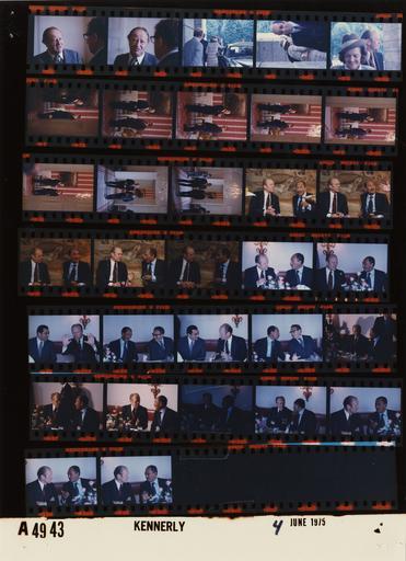 | Keywords: Ford A4943 NLGRF photo contact sheet (1975-06-01)(Gerald Ford Library).jpg White House Photographic Office WHPO is housed at the Gerald R Ford Presidential Library a branch of the National Archives and Records Administration NARA <br/><br/> This file is a 200 dpi photo contact sheet having images from roll of film A4943 of the August 9 1974 - January 20 1977 Gerald R Ford White House Photographic Office Series A0001-A9999 and B0001-B2886 photographs <br/><br/> The date on the photo contact sheet is the date the roll of film was processed not necessarily the date the photographs were taken See table below for additional details 1975-06-01 Gerald R Ford Presidential Library Image http //www fordlibrarymuseum gov/library/whphotos/A4943_NLGRF jpg A4943_NLGRF jpg from http //www fordlibrarymuseum gov/library/whphotos/19750601whpo pdf White House Photographs June 1 1975 of the http //www fordlibrarymuseum gov/Library/whphotos/whpo asp White House Photographic Collection page White House Photographic Office WHPO <br/> Creator David Hume Kennerly PD-USGov Institution Institution Gerald R Ford Presidential Library Table wikitable sortable + Photo contact sheet A4943 U S President Ford Administration Gerald R Ford Library Frame s Tone Subject proper Subject generic Names Geographic Location Photographer Date - 1A-2A Color Trip to Austria - Meeting With Chancellor of Austria seated talking; HAK in foreground back to camera; close ups Kissinger Bruno Kreisky Salzburg Austria Sitting Room - Hotel Schloss Klessheim Kennerly 1975-06-01 - 3A-5A Color Trip to Austria - Departure of Chancellor of Austria standing near limousine waving walking toward door GRF Betty Ford Salzburg Austria Hotel Schloss Klessheim -Outside Kennerly 1975-06-01 - 6A-11A Color Trip to Austria standing talking; several taken through doorway from corridor GRF Kissinger Salzburg Austria Sitting Room - Hotel Schloss Klessheim Kennerly 1975-06-01 - 12A-13A Color Trip to Austria walking talking GRF Kissinger Salzburg Austria Hotel Schloss Klessheim Kennerly 1975-06-01 - 14A-18A Color Trip to Austria - Meeting with President of Egypt seated talking; close up GRF Anwar Al-Sadat Salzburg Austria Hotel Schloss Fuschl Kennerly 1975-06-01 - 19A-33A Color Trip to Austria - Luncheon Hosted by the President of Egypt seated talking at table; GRF and Mubarek in 3rd and 5th frames GRF Anwar Al-Sadat Salzburg Austria Hotel Schloss Fuschl - Luncheon Room Kennerly 1975-06-01 Gerald R Ford Presidential Library and Museum-cooperation PD-USGov Contact sheets by the Ford White House June 1975 Photographs by David Hume Kennerly from 1975 |