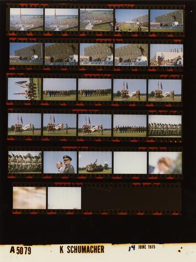 Keywords: Ford A5079 NLGRF photo contact sheet (1975-06-14)(Gerald Ford Library).jpg White House Photographic Office WHPO is housed at the Gerald R Ford Presidential Library a branch of the National Archives and Records Administration NARA <br/><br/> This file is a 200 dpi photo contact sheet having images from roll of film A5079 of the August 9 1974 - January 20 1977 Gerald R Ford White House Photographic Office Series A0001-A9999 and B0001-B2886 photographs <br/><br/> The date on the photo contact sheet is the date the roll of film was processed not necessarily the date the photographs were taken See table below for additional details 1975-06-14 Gerald R Ford Presidential Library Image http //www fordlibrarymuseum gov/library/whphotos/A5079_NLGRF jpg A5079_NLGRF jpg from http //www fordlibrarymuseum gov/library/whphotos/19750614whpo pdf White House Photographs June 14 1975 of the http //www fordlibrarymuseum gov/Library/whphotos/whpo asp White House Photographic Collection page White House Photographic Office WHPO - Schumacher PD-USGov Institution Institution Gerald R Ford Presidential Library Table wikitable sortable + Photo contact sheet A5079 U S President Ford Administration Gerald R Ford Library Frame s Tone Subject proper Subject generic Names Geographic Location Photographer Date - 15-27 Color Trip to Georgia - 200th Anniversary of the U S Army Infantry - Columbus Georgia no subject Columbus GA Fort Benning -York Field Schumacher 1975-06-14 - 2-4 Color Trip to Georgia - 200th Anniversary of the U S Army Infantry - Columbus Georgia long shots from roof of Infantry Hall Columbus GA Fort Benning -York Field Schumacher 1975-06-14 - 5-11 Color Trip to Georgia - 200th Anniversary of the U S Army Infantry - Columbus Georgia GRF speaking at podium; infantryman statue in background; various angles and distances; all not in every frame GRF Maj Gen Tarpley Guests Crowd Columbus GA Fort Benning -Reviewing Stand Schumacher 1975-06-14 - 12 Color Trip to Georgia - 200th Anniversary of the U S Army Infantry - Columbus Georgia dressed in colonial uniforms Color Guard Columbus GA Fort Benning -York Field Schumacher 1975-06-14 - 13-14 Color Trip to Georgia - 200th Anniversary of the U S Army Infantry - Columbus Georgia dressed in uniforms marking key periods in Army history U S Army Soldiers Columbus GA Fort Benning -York Field Schumacher 1975-06-14 - 15-19 Color Trip to Georgia - 200th Anniversary of the U S Army Infantry - Columbus Georgia dressed in colonial uniforms; Officer in modern uniform; attaching new ribbon to flag standard Color Guard; Officer Columbus GA Fort Benning -York Field Schumacher 1975-06-14 - 20 Color Trip to Georgia - 200th Anniversary of the U S Army Infantry - Columbus Georgia dressed in uniforms marking key periods in Army history U S Army Soldiers Columbus GA Fort Benning -York Field Schumacher 1975-06-14 - 21-22 Color Trip to Georgia - 200th Anniversary of the U S Army Infantry - Columbus Georgia marching in review Army Rangers Columbus GA Fort Benning -York Field Schumacher 1975-06-14 - 23 Color Trip to Georgia - 200th Anniversary of the U S Army Infantry - Columbus Georgia standing watching review; close up GRF Army Officer Columbus GA Fort Benning -York Field Schumacher 1975-06-14 - 24 Color Trip to Georgia - 200th Anniversary of the U S Army Infantry - Columbus Georgia Armored Personnel Carrier in action Columbus GA Fort Benning -York Field Schumacher 1975-06-14 Gerald R Ford Presidential Library and Museum-cooperation PD-USGov Contact sheets by the Ford White House June 1975 |