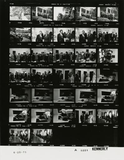 | Keywords: Ford A5229 NLGRF photo contact sheet (1975-06-25)(Gerald Ford Library).jpg White House Photographic Office WHPO is housed at the Gerald R Ford Presidential Library a branch of the National Archives and Records Administration NARA <br/><br/> This file is a 200 dpi photo contact sheet having images from roll of film A5229 of the August 9 1974 - January 20 1977 Gerald R Ford White House Photographic Office Series A0001-A9999 and B0001-B2886 photographs <br/><br/> The date on the photo contact sheet is the date the roll of film was processed not necessarily the date the photographs were taken See table below for additional details 1975-06-25 Gerald R Ford Presidential Library Image http //www fordlibrarymuseum gov/library/whphotos/A5229_NLGRF jpg A5229_NLGRF jpg from http //www fordlibrarymuseum gov/library/whphotos/19750625whpo pdf White House Photographs June 25 1975 of the http //www fordlibrarymuseum gov/Library/whphotos/whpo asp White House Photographic Collection page White House Photographic Office WHPO <br/> Creator David Hume Kennerly PD-USGov Institution Institution Gerald R Ford Presidential Library Table wikitable sortable + Photo contact sheet A5229 U S President Ford Administration Gerald R Ford Library Frame s Tone Subject proper Subject generic Names Geographic Location Photographer Date - 21A-25A BW Secretary of the Treasury standing together talking GRF Simon Scheduling and Advance Office Kennerly 1975-06-25 - 2A BW Prior Meeting with Korean Parliamentarians and Members of Congressmen Who Served in Korea walking talking GRF O'Donnell Rose Garden Kennerly 1975-06-25 - 3A-7A BW Meeting with Korean Parliamentarians and Members of Congressmen Who Served in Korea standing posing on steps; all not in every frame; various angles and distances GRF Korean Parliamentarians Members of Congress Rose Garden Kennerly 1975-06-25 - 8A-10A BW Meeting with Korean Parliamentarians and Members of Congressmen Who Served in Korea walking talking laughing GRF Rep Murphy Colonnade Kennerly 1975-06-25 - 11A-18A BW Meeting with Korean Parliamentarians and Members of Congressmen Who Served in Korea standing talking; various angles and distances; all not in every frame GRF Korean Parliamentarians Members of Congress Oval Office Kennerly 1975-06-25 - 19A-20A BW Visiting Actress; Husband and Manager; Agent greeting handshaking standing talking; various angles and distances; all not in every frame GRF Michael Viner Deborah Raffin Ronnie Cohen-Chasen Scheduling and Advance Office Kennerly 1975-06-25 - 26A-30A BW Visiting Actress standing together talking; Raffin seated in foreground joined by Scowcroft in frames 29A 30A GRF Simon; Deborah Raffin; Scowcroft Scheduling and Advance Office Kennerly 1975-06-25 - 31A-33A BW Prior to Cabinet Meeting standing near table GRF Kissinger Schlesinger Weinberger Others Cabinet Room Kennerly 1975-06-25 Gerald R Ford Presidential Library and Museum-cooperation PD-USGov Contact sheets by the Ford White House June 1975 Photographs by David Hume Kennerly from 1975 |