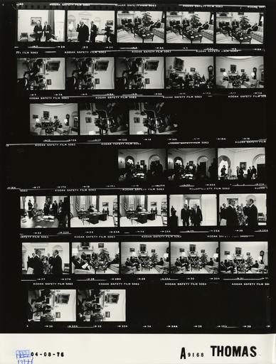 | Keywords: Ford A9168 NLGRF photo contact sheet (1976-04-08)(Gerald Ford Library).jpg White House Photographic Office WHPO is housed at the Gerald R Ford Presidential Library a branch of the National Archives and Records Administration NARA <br/><br/> This file is a 200 dpi photo contact sheet having images from roll of film A9168 of the August 9 1974 - January 20 1977 Gerald R Ford White House Photographic Office Series A0001-A9999 and B0001-B2886 photographs <br/><br/> The date on the photo contact sheet is the date the roll of film was processed not necessarily the date the photographs were taken See table below for additional details 1976-04-08 Gerald R Ford Presidential Library Image http //www fordlibrarymuseum gov/library/whphotos/A9168_NLGRF jpg A9168_NLGRF jpg from http //www fordlibrarymuseum gov/library/whphotos/19760408whpo pdf White House Photographs April 8 1976 of the http //www fordlibrarymuseum gov/Library/whphotos/whpo asp White House Photographic Collection page White House Photographic Office WHPO - Thomas PD-USGov Institution Institution Gerald R Ford Presidential Library Table wikitable sortable + Photo contact sheet A9168 U S President Ford Administration Gerald R Ford Library Frame s Tone Subject proper Subject generic Names Geographic Location Photographer Date - 2-14 BW Meeting with Pepsico Board Chairman and Co-Chairman of US-USSR Trade and Economic Council standing handshaking; seated in chairs by fireplace and sofa GRF Donald Kendall; Scowcroft Oval Office Thomas 1976-04-08 - 15-18 BW Thomas 1976-04-08 - 19-22 BW Meeting with Canadian Governor General Leger and Canadian Ambassador to US Warrenprior to waiting talking Gov Mrs Jules Leger Jack Hamilton Warren Clement Conger Others Cabinet Room Thomas 1976-04-08 - 23-24 BW President at Work in Oval Office standing at desk reading papers GRF Oval Office Thomas 1976-04-08 - 25-33 BW Meeting with Canadian Governor General Leger and Canadian Ambassador to US Warren; White House Curator Conger Leger et al entering; seated in chairs by fireplace and sofas; Leger GRF in chairs by sofas GRF Gov Mrs Jules Leger Jack Hamilton Warren Clement Conger Scowcroft Oval Office Thomas 1976-04-08 Gerald R Ford Presidential Library and Museum-cooperation PD-USGov Contact sheets by the Ford White House April 1976 |