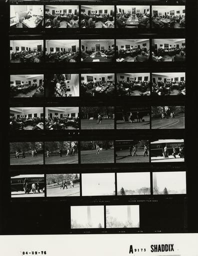 | Keywords: Ford A9173 NLGRF photo contact sheet (1976-04-09)(Gerald Ford Library).jpg White House Photographic Office WHPO is housed at the Gerald R Ford Presidential Library a branch of the National Archives and Records Administration NARA <br/><br/> This file is a 200 dpi photo contact sheet having images from roll of film A9173 of the August 9 1974 - January 20 1977 Gerald R Ford White House Photographic Office Series A0001-A9999 and B0001-B2886 photographs <br/><br/> The date on the photo contact sheet is the date the roll of film was processed not necessarily the date the photographs were taken See table below for additional details 1976-04-09 Gerald R Ford Presidential Library Image http //www fordlibrarymuseum gov/library/whphotos/A9173_NLGRF jpg A9173_NLGRF jpg from http //www fordlibrarymuseum gov/library/whphotos/19760409whpo pdf White House Photographs April 9 1976 of the http //www fordlibrarymuseum gov/Library/whphotos/whpo asp White House Photographic Collection page White House Photographic Office WHPO - Shaddix PD-USGov Institution Institution Gerald R Ford Presidential Library Table wikitable sortable + Photo contact sheet A9173 U S President Ford Administration Gerald R Ford Library Frame s Tone Subject proper Subject generic Names Geographic Location Photographer Date - 4A BW Photo Office Secretary seated at desk talking on telephone Kathy Tindle White House Photo Office Shaddix 1976-04-09 - 20A BW Businessmen Briefing by John Vickerman seated at table in in chairs; various angles and distances Vickerman Businessmen Roosevelt Room Shaddix 1976-04-09 - 21A-22A BW Trip to Texas-depart for; Press Secretary walking across lawn with suitcase; approaching Marine I helicopter Nessen; Lukash South Lawn Shaddix 1976-04-09 - 23A-25A BW Departure for Trip to Texas; US Senator from Texas TX walking across lawn with suitcases; Cheney with crutches Hartmann Sen John Tower Cavaney O'Donnell; Cheney South Lawn Shaddix 1976-04-09 - 26A-27A BW Trip to Texas-depart for Cheney walking across lawn with crutches approaching helicopter Cheney; Cavaney South Lawn Shaddix 1976-04-09 - 278A29A BW Trip to Texas-depart for boarding helicopter Lukash O'Donnell Cavaney Others South Lawn Shaddix 1976-04-09 - 30A BW Trip to Texas-depart for walking across grass to board helicopter GRF Secret Service South Lawn Shaddix 1976-04-09 - 31A-35A BW Trip to Texas-depart for; helicopter US Capitol Washington Monument; Marine I Marine One flying over US Capitol and by Washington Monument Marine One in flight Shaddix 1976-04-09 Gerald R Ford Presidential Library and Museum-cooperation PD-USGov Contact sheets by the Ford White House April 1976 |