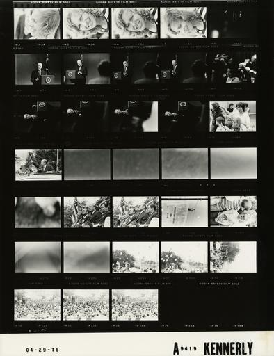 | Keywords: Ford A9419 NLGRF photo contact sheet (1976-04-29)(Gerald Ford Library).jpg White House Photographic Office WHPO is housed at the Gerald R Ford Presidential Library a branch of the National Archives and Records Administration NARA <br/><br/> This file is a 200 dpi photo contact sheet having images from roll of film A9419 of the August 9 1974 - January 20 1977 Gerald R Ford White House Photographic Office Series A0001-A9999 and B0001-B2886 photographs <br/><br/> The date on the photo contact sheet is the date the roll of film was processed not necessarily the date the photographs were taken See table below for additional details 1976-04-29 Gerald R Ford Presidential Library Image http //www fordlibrarymuseum gov/library/whphotos/A9419_NLGRF jpg A9419_NLGRF jpg from http //www fordlibrarymuseum gov/library/whphotos/19760429whpo pdf White House Photographs April 29 1976 of the http //www fordlibrarymuseum gov/Library/whphotos/whpo asp White House Photographic Collection page White House Photographic Office WHPO <br/> Creator David Hume Kennerly PD-USGov Institution Institution Gerald R Ford Presidential Library Table wikitable sortable + Photo contact sheet A9419 U S President Ford Administration Gerald R Ford Library Frame s Tone Subject proper Subject generic Names Geographic Location Photographer Date - 2A-5A BW Primary Campaign Trip to Texas close up smiling Unidentified Woman Houston TX Hyatt Regency Hotel - Imperial Ballroom West Kennerly 1976-04-29 - 6A BW Kennerly 1976-04-29 - 7A-15A BW Primary Campaign Trip to Texas-President's 31st Press Conference sponsored by Houston Chapter of Sigma Delta Chi national journalism fraternity GRF at podium in dark room midrange; GRF; Media Houston TX Hyatt Regency Hotel - Imperial Ballroom West Kennerly 1976-04-29 - 16A BW Primary Campaign Trip to Texas-Parade in Honor of GRF Unveiling Ceremony for Montgomery County Texas War Memorial Park standing waving Unidentified Woman Children Conroe TX Streets of Conroe Kennerly 1976-04-29 - 17A BW Primary Campaign Trip to Texas-Parade in Honor of GRF Unveiling Ceremony for Montgomery County Texas War Memorial Park GRF standing in sunroof waving GRF Secret Service Conroe TX Streets of Conroe Kennerly 1976-04-29 - 18A-22A BW Kennerly 1976-04-29 - 23A-24A BW Primary Campaign Trip to Texas-Parade in Honor of GRF Unveiling Ceremony for Montgomery County Texas War Memorial Park-Remarks seated on platform listening to speaker not seen GRF Sen John Tower Mayor W T Bud Hooper Rev Charles Godbey Conroe TX Montgomery County War Memorial Park Kennerly 1976-04-29 - 25A BW Primary Campaign Trip to Texas-Parade in Honor of GRF Unveiling Ceremony for Montgomery County Texas War Memorial Park-Remarks standing on roof of Montgomery County Courtroom Annex Police Officer Conroe TX Montgomery County War Memorial Park Kennerly 1976-04-29 - 26A BW Primary Campaign Trip to Texas-Parade in Honor of GRF Unveiling Ceremony for Montgomery County Texas War Memorial Park-Remarks seated listening Two Children Conroe TX Montgomery County War Memorial Park Kennerly 1976-04-29 - 27A-28A BW Kennerly 1976-04-29 - 29A-34A BW Primary Campaign Trip to Texas-Parade in Honor of GRF Unveiling Ceremony for Montgomery County Texas War Memorial Park-Remarks GRF at lectern balloons in air; various angles and distances GRF Sen John Tower Mayor W T Bud Hooper Rev Charles Godbey; Others Crowd Conroe TX Montgomery County War Memorial Park Kennerly 1976-04-29 Gerald R Ford Presidential Library and Museum-cooperation PD-USGov Contact sheets by the Ford White House April 1976 Photographs by David Hume Kennerly from 1976 |