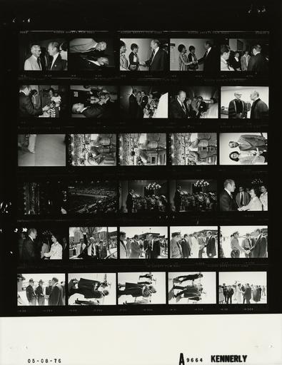 | Keywords: Ford A9664 NLGRF photo contact sheet (1976-05-08)(Gerald Ford Library).jpg  White House Photographic Office WHPO is housed at the Gerald R Ford Presidential Library a branch of the National Archives and Records Administration NARA <br/><br/> This file is a 200 dpi photo contact sheet having images from roll of film A9664 of the August 9 1974 - January 20 1977 Gerald R Ford White House Photographic Office Series A0001-A9999 and B0001-B2886 photographs <br/><br/> The date on the photo contact sheet is the date the roll of film was processed not necessarily the date the photographs were taken See table below for additional details 1976-05-08 Gerald R Ford Presidential Library Image http //www fordlibrarymuseum gov/library/whphotos/A9664_NLGRF jpg A9664_NLGRF jpg from http //www fordlibrarymuseum gov/library/whphotos/19760508whpo pdf White House Photographs May 8 1976 of the http //www fordlibrarymuseum gov/Library/whphotos/whpo asp White House Photographic Collection page White House Photographic Office WHPO <br/> Creator David Hume Kennerly PD-USGov Institution Institution Gerald R Ford Presidential Library Table wikitable sortable + Photo contact sheet A9664 U S President Ford Administration Gerald R Ford Library Frame s Tone Subject proper Subject generic Names Geographic Location Photographer Date - 3A-11A BW Trip to Nebraska; Breakfast Reception for Nebraska State PFC Staff and Volunteers - Omaha Nebraska standing talking; handshaking GRF Unidentified Men Women Children Omaha NE Holiday Inn West - Empire Room Kennerly 1976-05-08 - 12A BW Trip to Nebraska; University of Nebraska 1976 Commencement Exercises; University President Varner - Lincoln Nebraska seated talking; wearing robes GRF Durward Woody Varner Lincoln NE University of Nebraska Sports Center -Robing Room Kennerly 1976-05-08 - 13A BW Kennerly 1976-05-08 - 14A-16A BW Trip to Nebraska; University of Nebraska 1976 Commencement Exercises; United States Secret Service - Lincoln Nebraska standing back to back in profile at end of podium Two Unidentified Secret Service; Audience Lincoln NE University of Nebraska Sports Center Kennerly 1976-05-08 - 17A BW Trip to Nebraska; University of Nebraska 1976 Commencement Exercises -Lincoln Nebraska standing posing Unidentified Man Woman Lincoln NE University of Nebraska Sports Center Kennerly 1976-05-08 - 18A-19A BW Trip to Nebraska; University of Nebraska 1976 Commencement Exercises; Remarks -Lincoln Nebraska GRF at podium very long view of gymnasium with 15 000 people GRF Audience Lincoln NE University of Nebraska Sports Center Kennerly 1976-05-08 - 20A-21A BW Trip to Nebraska; Reception for Nebraska State PFC Staff and Volunteers - Lincoln Nebraska GRF at microphone address to 150 persons applauding wearing PFC hats GRF PFC staff Volunteers Lincoln NE Lincoln Hilton Hotel - Grand Ballroom East Kennerly 1976-05-08 - 22A-23A BW Trip to Nebraska; Reception for Nebraska State PFC Staff and Volunteers - Lincoln Nebraska standing handshaking GRF O'Donnell female PFC staff Volunteers Lincoln NE Lincoln Hilton Hotel - Grand Ballroom East Kennerly 1976-05-08 - 24A BW Trip to Nebraska; Reception for Nebraska State PFC Staff and Volunteers; Departing - Lincoln Nebraska GRF waving on sidewalk GRF Pontius Crowd Lincoln NE Lincoln Hilton Hotel - Exterior Kennerly 1976-05-08 - 25A-28A BW Trip to Nebraska; Departing State -Lincoln Nebraska standing on tarmac handshaking saying goodbye GRF Media Unidentified Men Police Officers Lincoln NE Lincoln Municipal Airport Kennerly 1976-05-08 - 29A-32A BW Trip to Missouri-Airport Arrival; Greeting by First Lady standing embracing on tarmac GRF Betty Ford Kansas City MO Kansas City Municipal Airport Kennerly 1976-05-08 - 2-3 BW Trip to Missouri-Airport Arrival; Greeting by Missouri Governor handshaking on tarmac GRF Betty Ford Gov Mrs Christopher S Bond Kansas City MO Kansas City Municipal Airport Kennerly 1976-05-08 Gerald R Ford Presidential Library and Museum-cooperation PD-USGov Contact sheets by the Ford White House May 1976 Photographs by David Hume Kennerly from 1976 |