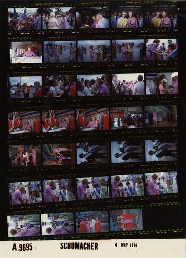 Keywords: Ford A9695 NLGRF photo contact sheet (1976-04-20)(Gerald Ford Library).jpg White House Photographic Office WHPO is housed at the Gerald R Ford Presidential Library a branch of the National Archives and Records Administration NARA <br/><br/> This file is a 200 dpi photo contact sheet having images from roll of film A9695 of the August 9 1974 - January 20 1977 Gerald R Ford White House Photographic Office Series A0001-A9999 and B0001-B2886 photographs <br/><br/> The date on the photo contact sheet is the date the roll of film was processed not necessarily the date the photographs were taken See table below for additional details 1976-04-20 Gerald R Ford Presidential Library Image http //www fordlibrarymuseum gov/library/whphotos/A9695_NLGRF jpg A9695_NLGRF jpg from http //www fordlibrarymuseum gov/library/whphotos/19760420whpo pdf White House Photographs April 20 1976 of the http //www fordlibrarymuseum gov/Library/whphotos/whpo asp White House Photographic Collection page White House Photographic Office WHPO - Schumacher PD-USGov Institution Institution Gerald R Ford Presidential Library Table wikitable sortable + Photo contact sheet A9695 U S President Ford Administration Gerald R Ford Library Frame s Tone Subject proper Subject generic Names Geographic Location Photographer Date - 18A Color First Lady Campaign Trip to Texas-Visit to PFC Headquarters-Departing from standing waving by doorway Betty Ford Others Harlingen TX President Ford Committee PFC Headquarters Schumacher 1976-04-20 - 19A-21A Color First Lady Campaign Trip to Texas-Visit to Austin Elementary School Bicentennial BF Littleton on stage; handshaking with children on stage holding name cards; children in Bicentennial clothing Betty Ford Vance Littleton Children Harlingen TX Austin Elementary School - Auditorium Schumacher 1976-04-20 - 22A-24A Color First Lady Campaign Trip to Texas-Airport Departure; Bicentennial little boys and girl standing on tarmac wearing banners Dwight Eisenhower Mamie Eisenhower and John Fitzgerald Kennedy Eisenhower wearing military garb Children Harlingen TX Harlingen International Airport Schumacher 1976-04-20 - 25A-31A Color First Lady Campaign Trip to Texas-Airport Departure; Bicentennial BF bending to shake hands with children wearing banners Gerald Ford and Betty Ford; also Patricia Nixon Betty Ford Children Harlingen TX Harlingen International Airport Schumacher 1976-04-20 - 32A-33A Color First Lady Campaign Trip to Texas-Airport Departure; PFC officials standing together posing in front of C-9 Aircraft Betty Ford Unidentified Man 2 women Harlingen TX Harlingen International Airport Schumacher 1976-04-20 - 0A-4A Color First Lady Campaign Trip to Texas -Departing San Antonio handshaking at rope; greeting at curb; posing inside Betty Ford Crowd cub scouts; Unidentified women San Antonio TX San Antonion International Airport Schumacher 1976-04-20 - 5A Color First Lady Campaign Trip to Texas-Aboard C-9 seated on plane pen in hand smiling Betty Ford Enroute McAllen TX Aboard C-9 Schumacher 1976-04-20 - 6A-13A Color First Lady Campaign Trip to Texas-Airport Arrival; Yellow Roses walking from plane receiving yellow roses flowers from Crowe's bending receiving gift from child talking to woman; all may not be shown Betty Ford; Mayor Jack Whetsell Mr Mrs Tommy Beardmore Mrs Trammel Crowe Mrs Edward Wallace The McAllen Chamber of Commerce Greeters Children in patriotic costume Crowd McAllen TX Miller International Airport Schumacher 1976-04-20 - 14A Color First Lady Campaign Trip to Texas-PFC Volunteers Republican Women Picnic Luncheon entering handshaking receiving daisies Betty Ford Unidentified Woman Harlingen TX President Ford Committee PFC Headquarters Schumacher 1976-04-20 - 15A-17A Color First Lady Campaign Trip to Texas-Visit to PFC Headquarters-Making Campaign Call from PFC Telephone Center seated talking on telephone others standing behind; midrange Betty Ford PFC Officials staff Harlingen TX President Ford Committee PFC Headquarters Schumacher 1976-04-20 Gerald R Ford Presidential Library and Museum-cooperation PD-USGov Contact sheets by the Ford White House April 1976