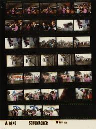 | Keywords: Ford A9849 NLGRF photo contact sheet (1976-05-15)(Gerald Ford Library).jpg White House Photographic Office WHPO is housed at the Gerald R Ford Presidential Library a branch of the National Archives and Records Administration NARA <br/><br/> This file is a 200 dpi photo contact sheet having images from roll of film A9849 of the August 9 1974 - January 20 1977 Gerald R Ford White House Photographic Office Series A0001-A9999 and B0001-B2886 photographs <br/><br/> The date on the photo contact sheet is the date the roll of film was processed not necessarily the date the photographs were taken See table below for additional details 1976-05-15 Gerald R Ford Presidential Library Image http //www fordlibrarymuseum gov/library/whphotos/A9849_NLGRF jpg A9849_NLGRF jpg from http //www fordlibrarymuseum gov/library/whphotos/19760515whpo pdf White House Photographs May 15 1976 of the http //www fordlibrarymuseum gov/Library/whphotos/whpo asp White House Photographic Collection page White House Photographic Office WHPO - Schumacher PD-USGov Institution Institution Gerald R Ford Presidential Library Table wikitable sortable + Photo contact sheet A9849 U S President Ford Administration Gerald R Ford Library Frame s Tone Subject proper Subject generic Names Geographic Location Photographer Date - 2A-9A Color Primary Campaign Whistle-Stop Tour of Michigan-Aboard Presidential Express BF standing greeting passengers; GRF handshaking; all not in every frame Betty Ford Others Secret Service Nessen GRF O'Donnell enroute to Lansing MI Aboard Train-Presidential Express Schumacher 1976-05-15 - 10A-34A Color Primary Campaign Whistle-Stop Tour of Michigan-Presidential Express Arrives Lansing-GRF Remarks standing on caboose waving; USSS and crowd on ground; GRF standing at microphone BF walking on ground handshaking at rope; umbrellas; frame 30A blank Betty Ford GRF Secret Service Crowd Lansing MI North Lansing Train Station Schumacher 1976-05-15 Gerald R Ford Presidential Library and Museum-cooperation PD-USGov Contact sheets by the Ford White House May 1976 |