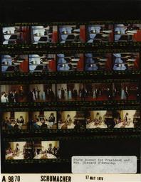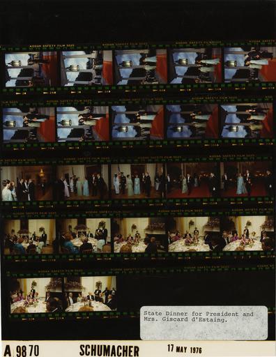 | Keywords: Ford A9870 NLGRF photo contact sheet (1976-05-17)(Gerald Ford Library).jpg White House Photographic Office WHPO is housed at the Gerald R Ford Presidential Library a branch of the National Archives and Records Administration NARA <br/><br/> This file is a 200 dpi photo contact sheet having images from roll of film A9870 of the August 9 1974 - January 20 1977 Gerald R Ford White House Photographic Office Series A0001-A9999 and B0001-B2886 photographs <br/><br/> The date on the photo contact sheet is the date the roll of film was processed not necessarily the date the photographs were taken See table below for additional details 1976-05-17 Gerald R Ford Presidential Library Image http //www fordlibrarymuseum gov/library/whphotos/A9870_NLGRF jpg A9870_NLGRF jpg from http //www fordlibrarymuseum gov/library/whphotos/19760517whpo pdf White House Photographs May 17 1976 of the http //www fordlibrarymuseum gov/Library/whphotos/whpo asp White House Photographic Collection page White House Photographic Office WHPO - Schumacher PD-USGov Institution Institution Gerald R Ford Presidential Library Table wikitable sortable + Photo contact sheet A9870 U S President Ford Administration Gerald R Ford Library Frame s Tone Subject proper Subject generic Names Geographic Location Photographer Date - 2-11 Color State Visit of French President Valery Giscard d'Estaing-State Dinner-Arrival Fords posing greeting d'Estaings at limo; foursome walking up steps posing; photographers shooting; Betty Ford wearing blue green pastel floral print sleeveless chiffon Estevez gown; formal wear; white tie GRF Betty Ford President Mrs Giscard d'Estaing; Amb Mrs Catto Kennerly Media Secret Service North Entrance Schumacher 1976-05-17 - 12-13 Color State Visit of French President Valery Giscard d'Estaing-State Dinner-Receiving Line; Bechtel president and former Treasury Secretary George Schultz standing talking; formal wear; white tie GRF Betty Ford President Mrs Giscard d'Estaing; Hon Mrs George Schultz Military Aide Honor Guard East Room Schumacher 1976-05-17 - 14 Color State Visit of French President Valery Giscard d'Estaing-State Dinner-Receiving Line foursome standing waiting; formal wear; white tie GRF Betty Ford President Mrs Giscard d'Estaing; Honor Guard East Room Schumacher 1976-05-17 - 15-16 Color State Visit of French President Valery Giscard d'Estaing-State Dinner walking on red carpet to State Dining Room; formal wear; white tie GRF Anne-Aymone Giscard d'Estaing; Valery Giscard d'Estaing Betty Ford Military Aides Cross Hall Schumacher 1976-05-17 - 17-18 Color State Visit of French President Valery Giscard d'Estaing-State Dinner; Actress Berenson Actor Borger New York Yankee Mantle 1976 Olympic Speed Skating Gold Medal winner Young; AmerAssocUnivWomen Pres Chambers President's table 10 seated around table talking; all may not be shown; formal wear; white tie GRF Anne-Aymone Giscard d'Estaing Sen Mike Mansfield Marisa Berenson Mickey Mantle Dr Majorie Chambers Samuel Newhouse Sheila Young Ray Bolger Mrs Charles Englehard State Dining Room Schumacher 1976-05-17 - 19-22 Color State Visit of French President Valery Giscard d'Estaing-State Dinner; Graham dancer; Ross Warner Communications; Galbreath Pittburg Pirates; Hines jazz pianist;Simpson fashion designer; Eastwood actor First Lady's table 11 seated around table talking; all may not be shown; formal wear; white tie Betty Ford Valery Giscard d'Estaing Martha Graham Steven Ross Mrs Foster Parker John Galbreath Mrs Archibald Randolph Earl Hines Adele Simpson Clint Eastwood; Waiters Kennerly State Dining Room Schumacher 1976-05-17 - 23 Color State Visit of French President Valery Giscard d'Estaing-State Dinner;; Actress Berenson Actor Borger New York Yankee Mantle 1976 Olympic Speed Skating Gold Medal winner Young; AmerAssocUnivWomen Pres Chambers President's table 10 seated around table talking; all may not be shown; formal wear; white tie GRF Anne-Aymone Giscard d'Estaing Sen Mike Mansfield Marisa Berenson Mickey Mantle Dr Majorie Chambers Samuel Newhouse Sheila Young Ray Bolger Mrs Charles Englehard State Dining Room Schumacher 1976-05-17 Gerald R Ford Presidential Library and Museum-cooperation PD-USGov Contact sheets by the Ford White House May 1976 |