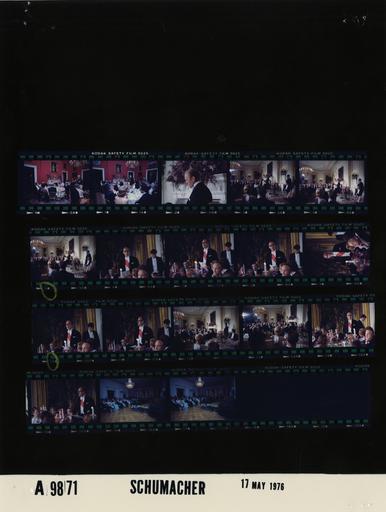 | Keywords: Ford A9871 NLGRF photo contact sheet (1976-05-17)(Gerald Ford Library).jpg White House Photographic Office WHPO is housed at the Gerald R Ford Presidential Library a branch of the National Archives and Records Administration NARA <br/><br/> This file is a 200 dpi photo contact sheet having images from roll of film A9871 of the August 9 1974 - January 20 1977 Gerald R Ford White House Photographic Office Series A0001-A9999 and B0001-B2886 photographs <br/><br/> The date on the photo contact sheet is the date the roll of film was processed not necessarily the date the photographs were taken See table below for additional details 1976-05-17 Gerald R Ford Presidential Library Image http //www fordlibrarymuseum gov/library/whphotos/A9871_NLGRF jpg A9871_NLGRF jpg from http //www fordlibrarymuseum gov/library/whphotos/19760517whpo pdf White House Photographs May 17 1976 of the http //www fordlibrarymuseum gov/Library/whphotos/whpo asp White House Photographic Collection page White House Photographic Office WHPO - Schumacher PD-USGov Institution Institution Gerald R Ford Presidential Library Table wikitable sortable + Photo contact sheet A9871 U S President Ford Administration Gerald R Ford Library Frame s Tone Subject proper Subject generic Names Geographic Location Photographer Date - 0A-1A Color State Visit of French President Valery Giscard d'Estaing-State Dinner guests seated at dinner tables violinists playing; formal wear; white tie Rockefeller Guests Army Strolling Strings Red Room Schumacher 1976-05-17 - 2A Color State Visit of French President Valery Giscard d'Estaing-State Dinner-GRF Remarks GRF standing making remarks close up profile; formal wear; white tie GRF State Dining Room Schumacher 1976-05-17 - 3A-5A Color State Visit of French President Valery Giscard d'Estaing-State Dinner-GRF Remarks GRF standing making remarks; guests seated at tables; long view; formal wear; white tie GRF Guests State Dining Room Schumacher 1976-05-17 - 6A-15A Color State Visit of French President Valery Giscard d'Estaing-State Dinner-Pres d'Estaing Remarks Pres d'Estaing standing making remarks; guests seated at tables; midrange and long view; formal wear; white tie Valery Giscard d'Estaing State Dining Room Schumacher 1976-05-17 - 16A-17A Color State Visit of French President Valery Giscard d'Estaing-State Dinner-After Dinner Entertainment by Marva Josie and Earl Fatha Hines guests seated applauding Hines at piano; formal wear; white tie GRF Betty Ford President Mrs Giscard d'Estaing Vice President Mrs Rockefeller Guests Earl Fatha Hines East Room Schumacher 1976-05-17 Gerald R Ford Presidential Library and Museum-cooperation PD-USGov Contact sheets by the Ford White House May 1976 |