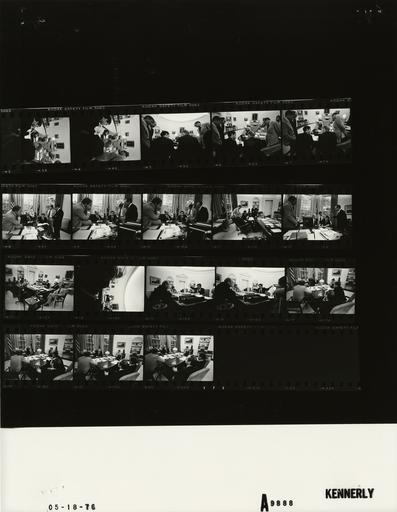 | Keywords: Ford A9888 NLGRF photo contact sheet (1976-05-18)(Gerald Ford Library).jpg White House Photographic Office WHPO is housed at the Gerald R Ford Presidential Library a branch of the National Archives and Records Administration NARA <br/><br/> This file is a 200 dpi photo contact sheet having images from roll of film A9888 of the August 9 1974 - January 20 1977 Gerald R Ford White House Photographic Office Series A0001-A9999 and B0001-B2886 photographs <br/><br/> The date on the photo contact sheet is the date the roll of film was processed not necessarily the date the photographs were taken See table below for additional details 1976-05-18 Gerald R Ford Presidential Library Image http //www fordlibrarymuseum gov/library/whphotos/A9888_NLGRF jpg A9888_NLGRF jpg from http //www fordlibrarymuseum gov/library/whphotos/19760518whpo pdf White House Photographs May 18 1976 of the http //www fordlibrarymuseum gov/Library/whphotos/whpo asp White House Photographic Collection page White House Photographic Office WHPO <br/> Creator David Hume Kennerly PD-USGov Institution Institution Gerald R Ford Presidential Library Table wikitable sortable + Photo contact sheet A9888 U S President Ford Administration Gerald R Ford Library Frame s Tone Subject proper Subject generic Names Geographic Location Photographer Date - 3A-20A BW Meeting with BBB O President Jordan and V P Maloney and consultant Penny Schneider; Batton Barton Durstine and Osborn Inc NY advertising firm seated standing around desk; Penny in light suit Maloney in dark suit; Jordan talking to GRF; Jordan gesticulating passionate GRF James J Jordan Jr Don Penny Schneider Cheney Raymond J Maloney Jr Oval Office Kennerly 1976-05-18 Gerald R Ford Presidential Library and Museum-cooperation PD-USGov Contact sheets by the Ford White House May 1976 Photographs by David Hume Kennerly from 1976 |