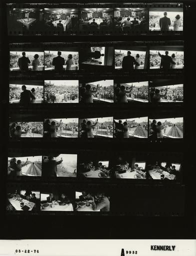 | Keywords: Ford A9932 NLGRF photo contact sheet (1976-05-15)(Gerald Ford Library).jpg White House Photographic Office WHPO is housed at the Gerald R Ford Presidential Library a branch of the National Archives and Records Administration NARA <br/><br/> This file is a 200 dpi photo contact sheet having images from roll of film A9932 of the August 9 1974 - January 20 1977 Gerald R Ford White House Photographic Office Series A0001-A9999 and B0001-B2886 photographs <br/><br/> The date on the photo contact sheet is the date the roll of film was processed not necessarily the date the photographs were taken See table below for additional details 1976-05-15 Gerald R Ford Presidential Library Image http //www fordlibrarymuseum gov/library/whphotos/A9932_NLGRF jpg A9932_NLGRF jpg from http //www fordlibrarymuseum gov/library/whphotos/19760515whpo pdf White House Photographs May 15 1976 of the http //www fordlibrarymuseum gov/Library/whphotos/whpo asp White House Photographic Collection page White House Photographic Office WHPO <br/> Creator David Hume Kennerly PD-USGov Institution Institution Gerald R Ford Presidential Library Table wikitable sortable + Photo contact sheet A9932 U S President Ford Administration Gerald R Ford Library Frame s Tone Subject proper Subject generic Names Geographic Location Photographer Date - 2-5 BW Primary Campaign Whistle-Stop Tour of Michigan-Breakfast Interview with Executives of Booth Newspapers of Michigan table set for lunch entering seated at table GRF executives Media Flint MI Holiday Inn-Banquet Room Kennerly 1976-05-15 - 6-23 BW Primary Campaign Whistle-Stop Tour of Michigan-Departing Flint Train Station GRF BF waving to crowd from caboose backs to camera; GRF BF on ground handshaking GRF Betty Ford Crowd Secret Service Media Flint MI Amtrak Rail Passenger Station Kennerly 1976-05-15 - 24-25 BW Primary Campaign Whistle-Stop Tour of Michigan-Aboard Presidential Express; First Lady wearing neck brace BF in neck brace talking to Schneider Betty Ford Don Penny Schneider GRF O'Donnell Others Enroute to Durand or Lansing MI aboard train - dining car Kennerly 1976-05-15 - 26-27 BW Primary Campaign Whistle-Stop Tour of Michigan-Aboard Presidential Express; First Lady wearing neck brace BF in neck brace talking to Schneider; O'Donnell talking to GRF; Detroit Free Press on table Betty Ford Don Penny Schneider GRF O'Donnell Enroute to Durand or Lansing MI aboard train - dining car Kennerly 1976-05-15 - 28 BW Primary Campaign Whistle-Stop Tour of Michigan-Aboard Presidential Express; Press Secretary seated at corner of dining table talking; GRF with coffee cup GRF Nessen Enroute to Durand or Lansing MI aboard train - dining car Kennerly 1976-05-15 - 29 BW Primary Campaign Whistle-Stop Tour of Michigan-Aboard Presidential Express; seated at dining table talking GRF Don Penny Schneider Enroute to Durand or Lansing MI aboard train - dining car Kennerly 1976-05-15 Gerald R Ford Presidential Library and Museum-cooperation PD-USGov Contact sheets by the Ford White House May 1976 Photographs by David Hume Kennerly from 1976 Neck braces |