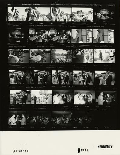 Keywords: Ford A9966 NLGRF photo contact sheet (1976-05-24)(Gerald Ford Library).jpg White House Photographic Office WHPO is housed at the Gerald R Ford Presidential Library a branch of the National Archives and Records Administration NARA <br/><br/> This file is a 200 dpi photo contact sheet having images from roll of film A9966 of the August 9 1974 - January 20 1977 Gerald R Ford White House Photographic Office Series A0001-A9999 and B0001-B2886 photographs <br/><br/> The date on the photo contact sheet is the date the roll of film was processed not necessarily the date the photographs were taken See table below for additional details 1976-05-24 Gerald R Ford Presidential Library Image http //www fordlibrarymuseum gov/library/whphotos/A9966_NLGRF jpg A9966_NLGRF jpg from http //www fordlibrarymuseum gov/library/whphotos/19760524whpo pdf White House Photographs May 24 1976 of the http //www fordlibrarymuseum gov/Library/whphotos/whpo asp White House Photographic Collection page White House Photographic Office WHPO <br/> Creator David Hume Kennerly PD-USGov Institution Institution Gerald R Ford Presidential Library Table wikitable sortable + Photo contact sheet A9966 U S President Ford Administration Gerald R Ford Library Frame s Tone Subject proper Subject generic Names Geographic Location Photographer Date - 17A BW Trip to California; Departing from Rossmoor Leisure World Campaign Rally -Walnut Creek California GRF and others walking by Cheney on phone back to camera GRF Cheney O'Donnell Helen Thomas Walnut Creek CA Rossmoor Leisure World Kennerly 1976-05-24 - 18A-24A BW Trip to California; Departing from Rossmoor Leisure World Campaign - Walnut Creek California standing handshaking GRF Tom Hayden Unidentified Men Women Children Walnut Creek CA Rossmoor Leisure World Kennerly 1976-05-24 - 25A-26A BW Trip to California; Presidential Suite; Personal Time - Walnut Creek California standing talking GRF Cheney Two Unidentified Men Walnut Creek CA Holiday Inn -Presidential Suite Kennerly 1976-05-24 - 27A-31A BW Trip to California; San Jose Jewish Federation Reception - San Jose California mingling; seated in circle talking GRF Don Glazer Guests San Jose CA Holiday Inn -Baja-Vera Cruz Rooms Kennerly 1976-05-24 - 3A-6A BW Trip to California; Walnut Creek Campaign Rally - Walnut Creek California handshaking GRF kissing cheerleader GRF Crowd cheerleaders Walnut Creek CA Walnut Creek Town Square Kennerly 1976-05-25 - 7A-10A BW Trip to California; Rossmoor Leisure World Campaign Rally; RLW Administrator Davis -Walnut Creek California seated at table Cheney standing talking GRF L Wayne Davis Cheney Walnut Creek CA Rossmoor Leisure World - Holding Room Kennerly 1976-05-25 - 11A-12A BW Trip to California; Rossmoor Leisure World Campaign Rally; Remarks -Walnut Creek California camera behind Cheney writing at table; GRF seen making remarks at podium through window Cheney; GRF Audience Walnut Creek CA Rossmoor Leisure World - Holding Room Kennerly 1976-05-25 - 13A-14A BW Trip to California; Rossmoor Leisure World Campaign Rally; Remarks -Walnut Creek California side view of GRF at podium USSS standing by GRF Secret Service Platform Guests Walnut Creek CA Rossmoor Leisure World Kennerly 1976-05-25 - 15A BW Trip to California; Rossmoor Leisure World Campaign Rally; Remarks -Walnut Creek California audience in foreground GRF in gazebo in background; long view GRF Audience Walnut Creek CA Rossmoor Leisure World Kennerly 1976-05-25 - 16A BW Trip to California; Departing from Rossmoor Leisure World Campaign Rally -Walnut Creek California handshaking at rope GRF Crowd Walnut Creek CA Rossmoor Leisure World Kennerly 1976-05-25 Gerald R Ford Presidential Library and Museum-cooperation PD-USGov Contact sheets by the Ford White House May 1976 Photographs by David Hume Kennerly from 1976 |