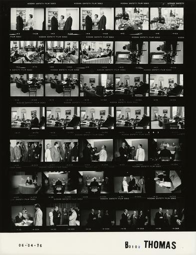 | Keywords: Ford B0101 NLGRF photo contact sheet (1976-06-05)(Gerald Ford Library).jpg White House Photographic Office WHPO is housed at the Gerald R Ford Presidential Library a branch of the National Archives and Records Administration NARA <br/><br/> This file is a 200 dpi photo contact sheet having images from roll of film B0101 of the August 9 1974 - January 20 1977 Gerald R Ford White House Photographic Office Series A0001-A9999 and B0001-B2886 photographs <br/><br/> The date on the photo contact sheet is the date the roll of film was processed not necessarily the date the photographs were taken See table below for additional details 1976-06-05 Gerald R Ford Presidential Library Image http //www fordlibrarymuseum gov/library/whphotos/B0101_NLGRF jpg B0101_NLGRF jpg from http //www fordlibrarymuseum gov/library/whphotos/19760605whpo pdf White House Photographs June 5 1976 of the http //www fordlibrarymuseum gov/Library/whphotos/whpo asp White House Photographic Collection page White House Photographic Office WHPO - Thomas PD-USGov Institution Institution Gerald R Ford Presidential Library Table wikitable sortable + Photo contact sheet B0101 U S President Ford Administration Gerald R Ford Library Frame s Tone Subject proper Subject generic Names Geographic Location Photographer Date - 2 B Ambassador Designate of the US to Luxembourg greeting handshaking GRF Rosemary L Ginn Oval Office Thomas 1976-06-05 - 3-4 B Ambassador Designate of the US to Luxembourg; Husband greeting handshaking standing talking GRF Rosemary L Ginn M Stanley Ginn Oval Office Thomas 1976-06-05 - 5-6 B Ambassador Designate of the US to Luxembourg seated talking on sofa GRF Rosemary L Ginn Oval Office Thomas 1976-06-05 - 7-9 B Ambassador Designate of the US to Luxembourg; Husband seated near firplace; various angles and distances GRF Rosemary L Ginn M Stanley Ginn Scowcroft Oval Office Thomas 1976-06-05 - 10-21 B Meeting with Political Consultant seated at desk talking; GRF holding smoking pipe; various angles and distances GRF Don Penny Schneider Oval Office Thomas 1976-06-05 - 22-23 B Arrival for Taping of Face the Nation - Vice President of CBS News; CBS Washington Bureau Chief; Producer Face the Nation standing talking smiling; all not in every frame GRF William Small Sanford Socolow Mary Yates; Others Washington DC Columbia Broadcasting System CBS Studios - Hallway Thomas 1976-06-05 - 24-25 B Prior to Taping of Face the Nation - United Press International UPI Correspondent; CBS News Correspondents standing talking smiling GRF Helen Thomas Bob Schieffer George Herman Washington DC Columbia Broadcasting System CBS Studio Thomas 1976-06-05 - 26 B Taping of Face the Nation -United Press International UPI Correspondent; CBS News Correspondents seated GRF's back to camera GRF Helen Thomas Bob Schieffer George Herman Washington DC Columbia Broadcasting System CBS Studio Thomas 1976-06-05 - 27 B Taping of Face the Nation seated behind Face the Nation desk GRF Washington DC Columbia Broadcasting System CBS Studio Thomas 1976-06-05 - 28-29 B Taping of Face the Nation -United Press International UPI Correspondent; CBS News Correspondents seated GRF's back to camera GRF Helen Thomas Bob Schieffer George Herman Washington DC Columbia Broadcasting System CBS Studio Thomas 1976-06-05 - 30-31 B Following Taping of Face the Nation -Producer Face the Nation standing talking smiling; all not in every frame GRF Mary Yates Nessen; Others Washington DC Columbia Broadcasting System CBS Studio Thomas 1976-06-05 - 32 B Following Taping of Face the Nation -CBS News Correspondent GRF seated signing autograph; Herman standing in front of desk GRF George Herman Washington DC Columbia Broadcasting System CBS Studio Thomas 1976-06-05 - 33 B Arrival for Taping of Face the Nation - CBS News Correspondent; Vice President of CBS News; CBS Washington Bureau Chief; Producer Face the Nation standing talking GRF George Herman William Small Sanford Socolow Mary Yates; Others Washington DC Columbia Broadcasting System CBS Studio Thomas 1976-06-05 - 34-36 B Arrival for Taping of Face the Nation - Vice President of CBS News; CBS Washington Bureau Chief standing talking laughing GRF William Small Sanford Socolow; Others Washington DC Columbia Broadcasting System CBS Studio Thomas 1976-06-05 Gerald R Ford Presidential Library and Museum-cooperation PD-USGov Contact sheets by the Ford White House June 1976 CBS News |