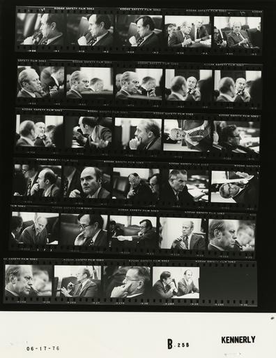 | Keywords: Ford B0255 NLGRF photo contact sheet (1976-06-17)(Gerald Ford Library).jpg White House Photographic Office WHPO is housed at the Gerald R Ford Presidential Library a branch of the National Archives and Records Administration NARA <br/><br/> This file is a 200 dpi photo contact sheet having images from roll of film B0255 of the August 9 1974 - January 20 1977 Gerald R Ford White House Photographic Office Series A0001-A9999 and B0001-B2886 photographs <br/><br/> The date on the photo contact sheet is the date the roll of film was processed not necessarily the date the photographs were taken See table below for additional details 1976-06-17 Gerald R Ford Presidential Library Image http //www fordlibrarymuseum gov/library/whphotos/B0255_NLGRF jpg B0255_NLGRF jpg from http //www fordlibrarymuseum gov/library/whphotos/19760617whpo pdf White House Photographs June 17 1976 of the http //www fordlibrarymuseum gov/Library/whphotos/whpo asp White House Photographic Collection page White House Photographic Office WHPO <br/> Creator David Hume Kennerly PD-USGov Institution Institution Gerald R Ford Presidential Library Table wikitable sortable + Photo contact sheet B0255 U S President Ford Administration Gerald R Ford Library Frame s Tone Subject proper Subject generic Names Geographic Location Photographer Date - 0A-2A B Beirut Lebanon Crisis - Meeting of the National Security Council seated at table; holding glasses; stem of glasses to mouth Bush Cabinet Room Kennerly 1976-06-17 - 3A B Beirut Lebanon Crisis - Meeting of the National Security Council seated at table; GRF speaking gesturing; others in background GRF Clements Marsh Cabinet Room Kennerly 1976-06-17 - 4A B Beirut Lebanon Crisis - Meeting of the National Security Council seated at table; GRF speaking gesturing; Kissinger seated to right GRF Kissinger Cabinet Room Kennerly 1976-06-17 - 5A-7A B Beirut Lebanon Crisis - Meeting of the National Security Council seated at table; smoking pipe; head and shoulder close up portrait GRF Cabinet Room Kennerly 1976-06-17 - 8A-10A B Beirut Lebanon Crisis - Meeting of the National Security Council seated at table; GRF in foreground smoking pipe out of focus; Marsh speaking gesturing GRF Marsh Cabinet Room Kennerly 1976-06-17 - 11A B Beirut Lebanon Crisis - Meeting of the National Security Council looking to side speaking gesturing; looking away from camera; close up Scowcroft Cabinet Room Kennerly 1976-06-17 - 12A B Beirut Lebanon Crisis - Meeting of the National Security Council seated at table; hand on chin; head and shoulders close up profile Marsh Cabinet Room Kennerly 1976-06-17 - 13A B Beirut Lebanon Crisis - Meeting of the National Security Council seated at table; smoking pipe GRF Cabinet Room Kennerly 1976-06-17 - 14A B Beirut Lebanon Crisis - Meeting of the National Security Council seated at table; head and shoulders close up profile Kissinger Cabinet Room Kennerly 1976-06-17 - 15A-16A B Beirut Lebanon Crisis - Meeting of the National Security Council seated at table; hand on chin in 1st frame; looking at camera in 2nd; head and shoulders close up profile; Bush in background Scowcroft; Bush Cabinet Room Kennerly 1976-06-17 - 17A B Beirut Lebanon Crisis - Meeting of the National Security Council seated at table; Brown speaking gesturing; Bush's left profile on right of frame George Brown Bush Cabinet Room Kennerly 1976-06-17 - 18A B Beirut Lebanon Crisis - Meeting of the National Security Council seated at table; speaking gesturing; head and shoulder close up portrait Clements Cabinet Room Kennerly 1976-06-17 - 19A B Beirut Lebanon Crisis - Meeting of the National Security Council seated at table; speaking gesturing; head and shoulder close up portrait Kissinger Cabinet Room Kennerly 1976-06-17 - 20A B Beirut Lebanon Crisis - Meeting of the National Security Council Kissinger speaking back to camera; GRF seated at table smoking pipe looking at Kissinger GRF Kissinger Cabinet Room Kennerly 1976-06-17 - 21A B Beirut Lebanon Crisis - Meeting of the National Security Council seated at table right hand to mouth; head and shoulder close up portrait Bush Cabinet Room Kennerly 1976-06-17 - 22A B Beirut Lebanon Crisis - Meeting of the National Security Council seated at table right hand to mouth; pointing with left hand holding pencil Bush Cabinet Room Kennerly 1976-06-17 - 23A B Beirut Lebanon Crisis - Meeting of the National Security Council seated at table holding pipe; head and shoulder portrait GRF Cabinet Room Kennerly 1976-06-17 - 24A-25A B Beirut Lebanon Crisis - Meeting of the National Security Council seated at table; smoking pipe; head and shoulder right profile portrait GRF Cabinet Room Kennerly 1976-06-17 - 26A B Beirut Lebanon Crisis - Meeting of the National Security Council seated at table; holding pipe; speaking gesturing; medium range GRF Cabinet Room Kennerly 1976-06-17 - 27A B Beirut Lebanon Crisis - Meeting of the National Security Council seated at table; listenng; left hand on chin; head and shoulder right profile portrait Clements Cabinet Room Kennerly 1976-06-17 - 28A B Beirut Lebanon Crisis - Meeting of the National Security Council seated at table; hands on chins; medium range Bush Scowcroft Cabinet Room Kennerly 1976-06-17 Gerald R Ford Presidential Library and Museum-cooperation PD-USGov Contact sheets by the Ford White House June 1976 Photographs by David Hume Kennerly from 1976 |