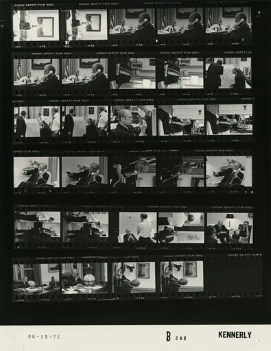 | Keywords: Ford B0282 NLGRF photo contact sheet (1976-06-19)(Gerald Ford Library).jpg White House Photographic Office WHPO is housed at the Gerald R Ford Presidential Library a branch of the National Archives and Records Administration NARA <br/><br/> This file is a 200 dpi photo contact sheet having images from roll of film B0282 of the August 9 1974 - January 20 1977 Gerald R Ford White House Photographic Office Series A0001-A9999 and B0001-B2886 photographs <br/><br/> The date on the photo contact sheet is the date the roll of film was processed not necessarily the date the photographs were taken See table below for additional details 1976-06-19 Gerald R Ford Presidential Library Image http //www fordlibrarymuseum gov/library/whphotos/B0282_NLGRF jpg B0282_NLGRF jpg from http //www fordlibrarymuseum gov/library/whphotos/19760619whpo pdf White House Photographs June 19 1976 of the http //www fordlibrarymuseum gov/Library/whphotos/whpo asp White House Photographic Collection page White House Photographic Office WHPO <br/> Creator David Hume Kennerly PD-USGov Institution Institution Gerald R Ford Presidential Library Table wikitable sortable + Photo contact sheet B0282 U S President Ford Administration Gerald R Ford Library Frame s Tone Subject proper Subject generic Names Geographic Location Photographer Date - 1A-2A B Beirut Lebanon Crisis - Late Night Meeting with National Security Adviser and Senior Staff Regarding the Crisis in Beirut Lebanon standing leaning on desk talking on telephone; coatless Scowcroft Scowcroft's Office Kennerly 1976-06-19 - 3A-7A B Beirut Lebanon Crisis - Late Night Meeting with National Security Adviser and Senior Staff Regarding the Crisis in Beirut Lebanon seated around desk; both talking on telephones GRF Scowcroft Scowcroft's Office Kennerly 1976-06-19 - 8A-9A B Beirut Lebanon Crisis - Late Night Meeting with National Security Adviser and Senior Staff Regarding the Crisis in Beirut Lebanon seated listening to someone off camera not seen GRF Scowcroft's Office Kennerly 1976-06-19 - 10A B Beirut Lebanon Crisis - Late Night Meeting with National Security Adviser and Senior Staff Regarding the Crisis in Beirut Lebanon GRF seated looking at map of Beirut; Hyland standing pointing at map back to camera GRF Hyland Scowcroft's Office Kennerly 1976-06-19 - 11A-12A B Beirut Lebanon Crisis - Late Night Meeting with National Security Adviser and Senior Staff Regarding the Crisis in Beirut Lebanon GRF seated looking at map of Beirut; Hyland standing pointing at map back to camera; Marsh standing nearby; Scowcroft in 1st frame only GRF Hyland Marsh Scowcroft Scowcroft's Office Kennerly 1976-06-19 - 13A B Beirut Lebanon Crisis - Late Night Meeting with National Security Adviser and Senior Staff Regarding the Crisis in Beirut Lebanon seated listening to someone off camera not seen ; gesturing with right hand; head and shoulders portrait GRF Scowcroft's Office Kennerly 1976-06-19 - 14A-15A B Beirut Lebanon Crisis - Late Night Meeting with National Security Adviser and Senior Staff Regarding the Crisis in Beirut Lebanon seated listening to someone off camera not seen ; right hand on chin holding glasses on lap with left hand GRF Scowcroft's Office Kennerly 1976-06-19 - 16A-20A B Beirut Lebanon Crisis - Late Night Meeting with National Security Adviser and Senior Staff Regarding the Crisis in Beirut Lebanon seated talking on telephone pointing gesturing with left hand; various angles and distances GRF Scowcroft's Office Kennerly 1976-06-19 - 21A-22A B Beirut Lebanon Crisis - Late Night Meeting with National Security Adviser and Senior Staff Regarding the Crisis in Beirut Lebanon standing talking face to face GRF Scowcroft Scowcroft's Office Kennerly 1976-06-19 - 23A-24A B Beirut Lebanon Crisis - Late Night Meeting with National Security Adviser and Senior Staff Regarding the Crisis in Beirut Lebanon GRF seated talking gesturing with right hand; Scowcroft facing GRF arms folded back to camera; various angles GRF Scowcroft Scowcroft's Office Kennerly 1976-06-19 - 25A B Beirut Lebanon Crisis - Late Night Meeting with National Security Adviser and Senior Staff Regarding the Crisis in Beirut Lebanon seated talking Cheney holding file folder GRF Cheney Hyland Scowcroft's Office Kennerly 1976-06-19 - 26A-29A B Beirut Lebanon Crisis - Late Night Stop in Oval Office Regarding the Crisis in Beirut Lebanon seated at desk talking on telephone; various angles and distances GRF Oval Office Kennerly 1976-06-19 Gerald R Ford Presidential Library and Museum-cooperation PD-USGov Contact sheets by the Ford White House June 1976 Photographs by David Hume Kennerly from 1976 |