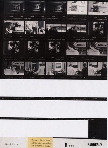 | Keywords: Ford B0295 NLGRF photo contact sheet (1976-06-20)(Gerald Ford Library).jpg White House Photographic Office WHPO is housed at the Gerald R Ford Presidential Library a branch of the National Archives and Records Administration NARA <br/><br/> This file is a 200 dpi photo contact sheet having images from roll of film B0295 of the August 9 1974 - January 20 1977 Gerald R Ford White House Photographic Office Series A0001-A9999 and B0001-B2886 photographs <br/><br/> The date on the photo contact sheet is the date the roll of film was processed not necessarily the date the photographs were taken See table below for additional details 1976-06-20 Gerald R Ford Presidential Library Image http //www fordlibrarymuseum gov/library/whphotos/B0295_NLGRF jpg B0295_NLGRF jpg from http //www fordlibrarymuseum gov/library/whphotos/19760620whpo pdf White House Photographs June 20 1976 of the http //www fordlibrarymuseum gov/Library/whphotos/whpo asp White House Photographic Collection page White House Photographic Office WHPO <br/> Creator David Hume Kennerly PD-USGov Institution Institution Gerald R Ford Presidential Library Table wikitable sortable + Photo contact sheet B0295 U S President Ford Administration Gerald R Ford Library Frame s Tone Subject proper Subject generic Names Geographic Location Photographer Date - 2A-4A B Beirut Lebanon Crisis - Late Night Meeting with National Security Adviser Regarding the Crisis in Beirut Lebanon walking toward camera; night shot; door to Palm Room in background GRF Scowcroft Colonnade Kennerly 1976-06-20 - 5A-6A B Beirut Lebanon Crisis - Late Night Meeting with National Security Adviser regarding the Crisis in Beirut Lebanon GRF seated in armchair hand on chin; Scowcroft standing leaning on desk; taken from behind GRF GRF Scowcroft Scowcroft's Office Kennerly 1976-06-20 - 7A B Beirut Lebanon Crisis - Late Night Meeting with National Security Adviser Regarding the Crisis in Beirut Lebanon GRF seated in armchair reading document; Hyland in background back to camera GRF Hyland Scowcroft's Office Kennerly 1976-06-20 - 8A B Beirut Lebanon Crisis - Late Night Meeting with National Security Adviser Regarding the Crisis in Beirut Lebanon GRF and Cheney seated in chairs; Marsh standing between GRF and Cheney in shirtsleeves GRF Marsh Cheney Scowcroft's Office Kennerly 1976-06-20 - 9A-14A B Beirut Lebanon Crisis - Late Night Telephone Call Regarding the Crisis in Beirut Lebanon seated at desk talking on telephone; photos taken through window from outside; night shots GRF Oval Office Kennerly 1976-06-20 - 15A-18A B Beirut Lebanon Crisis - Late Night Meeting with National Security Adviser Regarding the Crisis in Beirut Lebanon GRF seated at desk holding open newspaper; Scowcroft standing in front of desk back to camera GRF Scowcroft Oval Office Kennerly 1976-06-20 - 19A B Beirut Lebanon Crisis - Late Night Meeting with National Security Adviser and Senior Staff Regarding the Crisis in Beirut Lebanon GRF seated at Scowcroft's desk talking on telephone; Scowcroft seated on right of frame GRF Scowcroft Scowcroft's Office Kennerly 1976-06-20 - 20A-21A B Beirut Lebanon Crisis - Late Night Meeting with National Security Adviser and Senior Staff Regarding the Crisis in Beirut Lebanon GRF seated at Scowcroft's desk talking on telephone; Scowcroft and Hyland in foreground backs to camera GRF Scowcroft Hyland Scowcroft's Office Kennerly 1976-06-20 - 22A B REDACTED REDACTED Kennerly 1976-06-20 - 23A B REDACTED REDACTED Kennerly 1976-06-20 - 24A B REDACTED REDACTED Kennerly 1976-06-20 - 25A-35A B REDACTED REDACTED Kennerly 1976-06-20 Gerald R Ford Presidential Library and Museum-cooperation PD-USGov Contact sheets by the Ford White House June 1976 Photographs by David Hume Kennerly from 1976 |