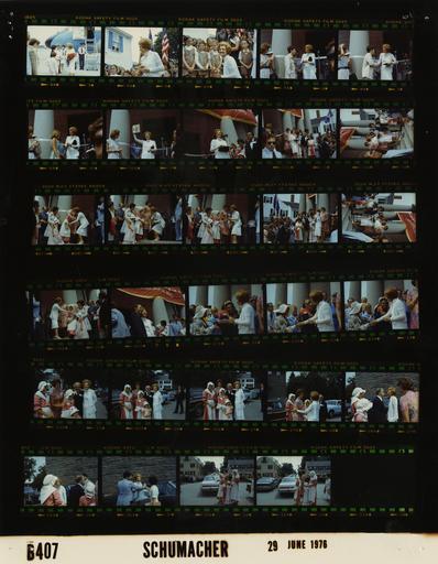 Keywords: Ford B0407 NLGRF photo contact sheet (1976-06-29)(Gerald Ford Library).jpg White House Photographic Office WHPO is housed at the Gerald R Ford Presidential Library a branch of the National Archives and Records Administration NARA <br/><br/> This file is a 200 dpi photo contact sheet having images from roll of film B0407 of the August 9 1974 - January 20 1977 Gerald R Ford White House Photographic Office Series A0001-A9999 and B0001-B2886 photographs <br/><br/> The date on the photo contact sheet is the date the roll of film was processed not necessarily the date the photographs were taken See table below for additional details 1976-06-29 Gerald R Ford Presidential Library Image http //www fordlibrarymuseum gov/library/whphotos/B0407_NLGRF jpg B0407_NLGRF jpg from http //www fordlibrarymuseum gov/library/whphotos/19760629whpo pdf White House Photographs June 29 1976 of the http //www fordlibrarymuseum gov/Library/whphotos/whpo asp White House Photographic Collection page White House Photographic Office WHPO - Schumacher PD-USGov Institution Institution Gerald R Ford Presidential Library Table wikitable sortable + Photo contact sheet B0407 U S President Ford Administration Gerald R Ford Library Frame s Tone Subject proper Subject generic Names Geographic Location Photographer Date - 4A Color First Lady's Trip to Massachusetts; Arrival for the Opening of the Exhibition Remember the Ladies in Plymouth; First Lady of Massachusetts; Commander Deputy Commander South Weymouth Naval Air Station NAS -South Weymouth Massachusetts BF standing at base of steps to C-9 aircraft holding bouquet of flowers; greeting handshaking; all may not be in frame Betty Ford Kitty Dukakis Capt Frank Sequeira Cmdr Mrs Al Dawson; Welcoming Committee; Naval Personnel South Weymouth MA South Weymouth Naval Air Station Schumacher 1976-06-29 - 5A-6A Color First Lady's Trip to Massachusetts MA -Arrival for Luncheon Prior to the Opening of the Exhibition Remember the Ladies in Plymouth - Presentation of Doll by Plymouth Girl Scouts greeting posing Betty Ford Girl Scouts Plymouth MA Plymouth Yacht Club - Outside Schumacher 1976-06-29 - 7A-9A Color First Lady's Trip to Massachusetts MA -Opening of the Exhibition Remember the Ladies in Plymouth BF standing between pillars greeting handshaking others; all not in every frame Betty Ford Joan Kennedy Nancy Kissinger Plymouth MA Pilgrim Hall - Outside Schumacher 1976-06-29 - 10A Color First Lady's Trip to Massachusetts MA -Opening of the Exhibition Remember the Ladies in Plymouth BF holding up program Betty Ford Others Plymouth MA Pilgrim Hall - Outside Schumacher 1976-06-29 - 11A Color First Lady's Trip to Massachusetts MA -Opening of the Exhibition Remember the Ladies in Plymouth BF speaking into microphone; various angles and distances; all not in every frame Betty Ford Others Plymouth MA Pilgrim Hall - Outside Schumacher 1976-06-29 - 12A-19A Color First Lady's Trip to Massachusetts MA -Opening of the Exhibition Remember the Ladies in Plymouth BF accepting gifts from people; various angles and distances; all not in frames Betty Ford Others Plymouth MA Pilgrim Hall - Outside Schumacher 1976-06-29 - 20A Color First Lady's Trip to Massachusetts MA -Opening of the Exhibition Remember the Ladies in Plymouth BF and man standing posing; others in background Betty Ford Uinidentified Man Others Plymouth MA Pilgrim Hall - Outside Schumacher 1976-06-29 - 21A-23A Color First Lady's Trip to Massachusetts MA -Opening of the Exhibition Remember the Ladies in Plymouth BF accepting gifts from people; various angles and distances; all not in frames Betty Ford Others Plymouth MA Pilgrim Hall - Outside Schumacher 1976-06-29 - 24A-28A Color First Lady's Trip to Massachusetts MA -Following Tour of the Exhibition Remember the Ladies in Plymouth standing posing; one woman and girls wearing pilgrim-era costumes; various angles and distances; all not in every frame Betty Ford Unidentified Man Women Two Girls Plymouth MA Pilgrim Hall - Outside Schumacher 1976-06-29 - 29A-30A Color First Lady's Trip to Massachusetts MA -Following Tour of the Exhibition Remember the Ladies in Plymouth standing talking near limousine; one woman and girl wearing pilgrim-era costumes; various angles and distances; all not in both frames Betty Ford Others Plymouth MA Pilgrim Hall - Outside Schumacher 1976-06-29 - 31A-32A Color First Lady's Trip to Massachusetts MA -Following Tour of the Exhibition Remember the Ladies in Plymouth standing at curb waving to Betty Ford's limousine as vehicle drives away Unidentified women Two Girls Plymouth MA Pilgrim Hall - Outside Schumacher 1976-06-29 Gerald R Ford Presidential Library and Museum-cooperation PD-USGov Contact sheets by the Ford White House June 1976 |